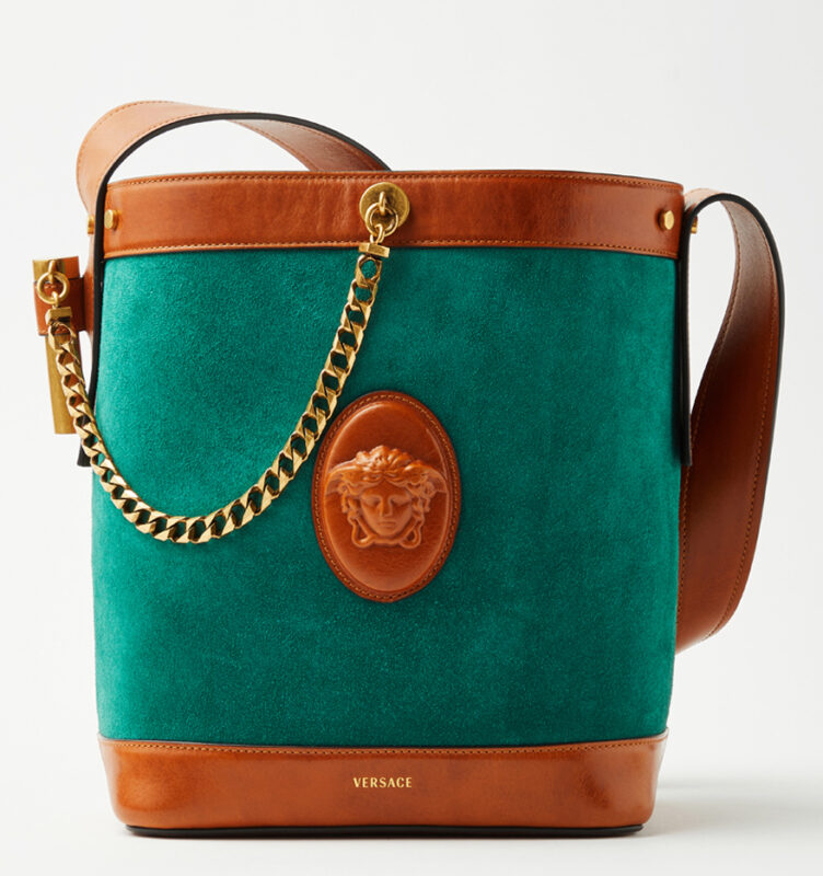 Seen in Dario Vitale’s first, and last, Versace collection, the Pivot bag is a study in Italian swagger. Offered in buttery leather or nubby suede, its slouchy bucket shape is finished with Medusa hardware and a flash of gold chain. It’s maximalist ease, with maximum drama. Molto Italiano.