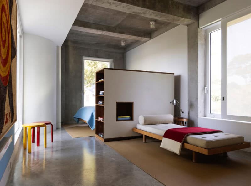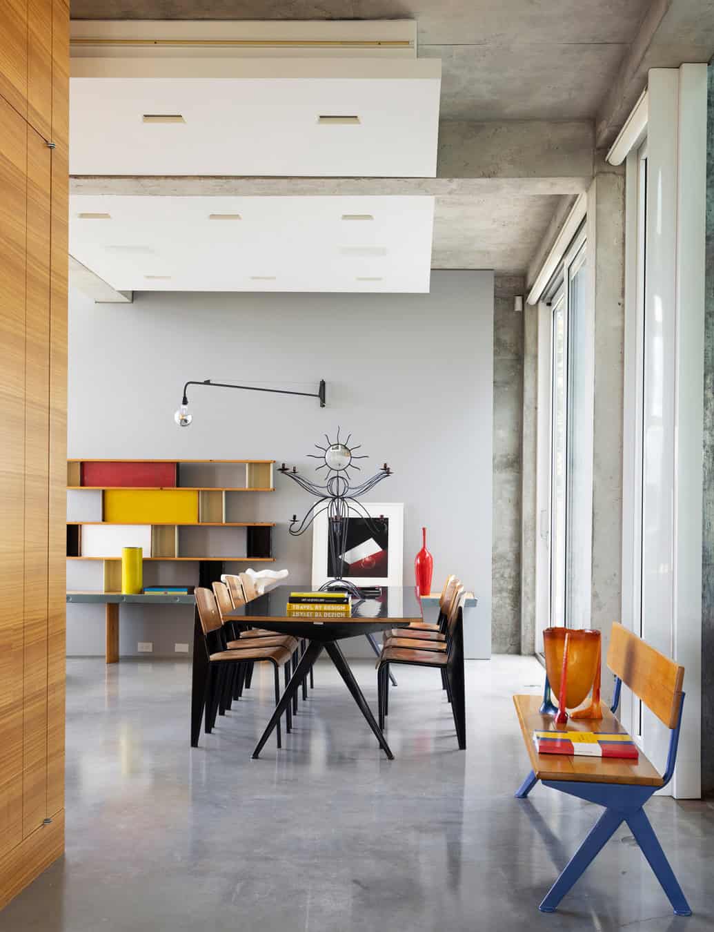 Inside, meanwhile, is a treasure trove of 20th-century design goodies. A 1960s wooden curved bench by Italian designer Charles Zublena offers an elegant landing within the home’s glass middle. Mindel grounds the dining room with classic chairs and a table by the French designer Jean Prouvé, dating to the 1950s, while a 1953 Tunisie bookcase by Charlotte Perriand adds color and verve to the room with its yellow and red painted shelves.