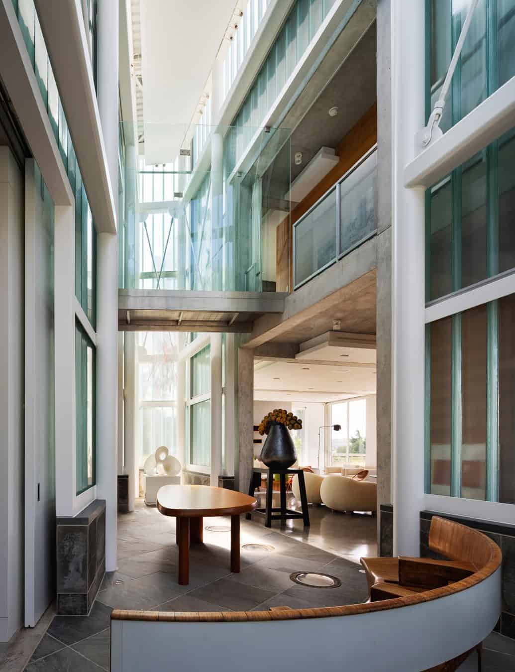 To be fair to Mindel’s opposition, the home doesn’t exactly blend in with the classic Hamptons shingle, colonial, or Greek revival styles that the area immediately conjures in the mind. Instead, it is, as he describes it, a “cracked egg,” whose north and south sides are made of concrete, but punctuated by a middle living space completely made of floor-to-ceiling glass (think of this as the yolk). Both the south and north facades take a nearly rectangular shape, with the north facing directly to the ocean. The lush surrounding yards, meanwhile, were done by RF Landscape Architecture. There is, however, a quality reminiscent of classic Hampton’s architecture that his neighbors may one day come to peace with. The ‘shells’ of the home are outfitted with a layer of cedarwood curtain walls that open and close, allowing for more light to filter in when he so chooses. In that way, they look like the sexier, sleeker version of the neighboring facades.