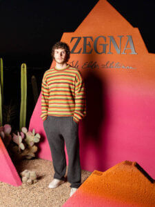 Afterward, Angelinos made their way to the Hollywood Hills, where the brands hosted a fête at a private residence designed by another famed architect Richard Neutra, outfitted in TES bright pink. During a Milan-style dinnatore, Hollywood guests such as Evan Peters, James Mardsen, and Kyle Maclachlan joined athletes Shareef O’Neal and Jalen Green, and the two designers to celebrate their collection while Faux Real, Chloé Caillet, Agathe Mougin, and Bianca Lexis staged live performances. The night was just the first of many between Zegna x The Elder Statesmen, who plan to continue the party in Chengdu, China and Singapore.