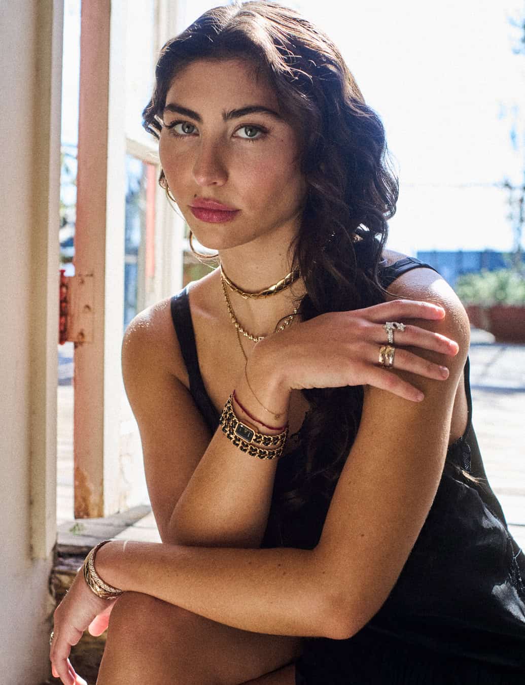 Toni wears Première Iconic Chain Double Row watch in steel coated in yellow gold with black leather and black-lacquered dial by CHANEL Watches, Talismans medal Reversible design necklace in 18k yellow gold with diamonds, Eternal N°5 diamond line necklace in 18k yellow gold with diamonds, Coco Crush supple quilted motif choker in 18k yellow gold, Coco Crush quilted motif hoops in 18k yellow gold, Coco Crush quilted motif bracelets in 18k beige gold with diamonds and yellow gold, Comète Géode ring in 18k white gold with diamonds, Coco Crush Toi et Moi quilted motif ring in 18k white and beige gold with diamonds, and Coco Crush quilted motif ring in 18k yellow gold by CHANEL Fine Jewelry