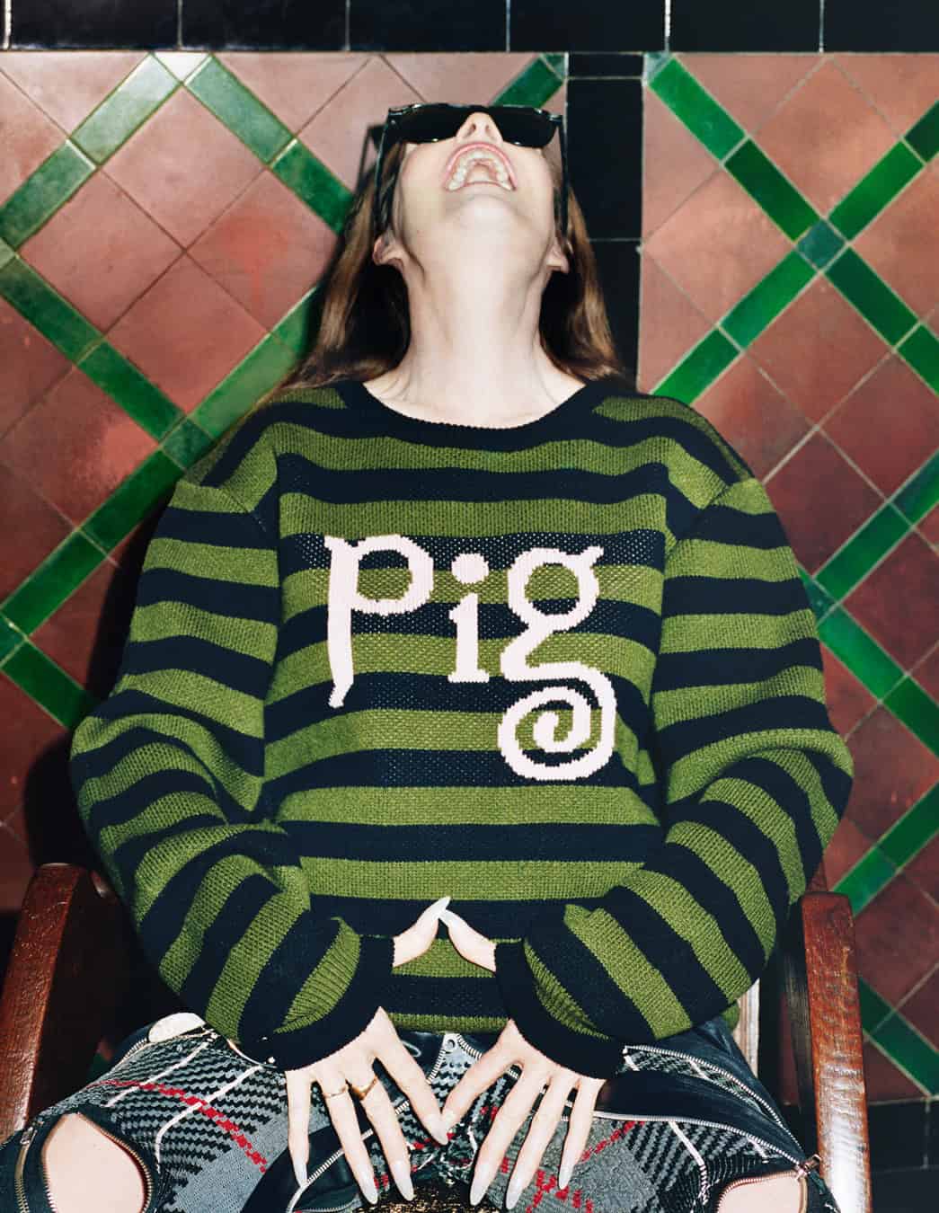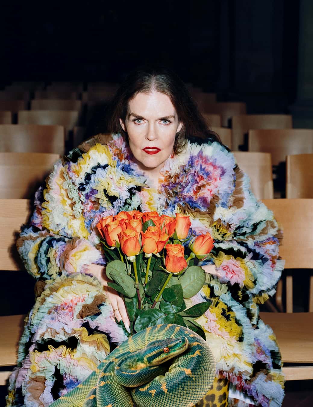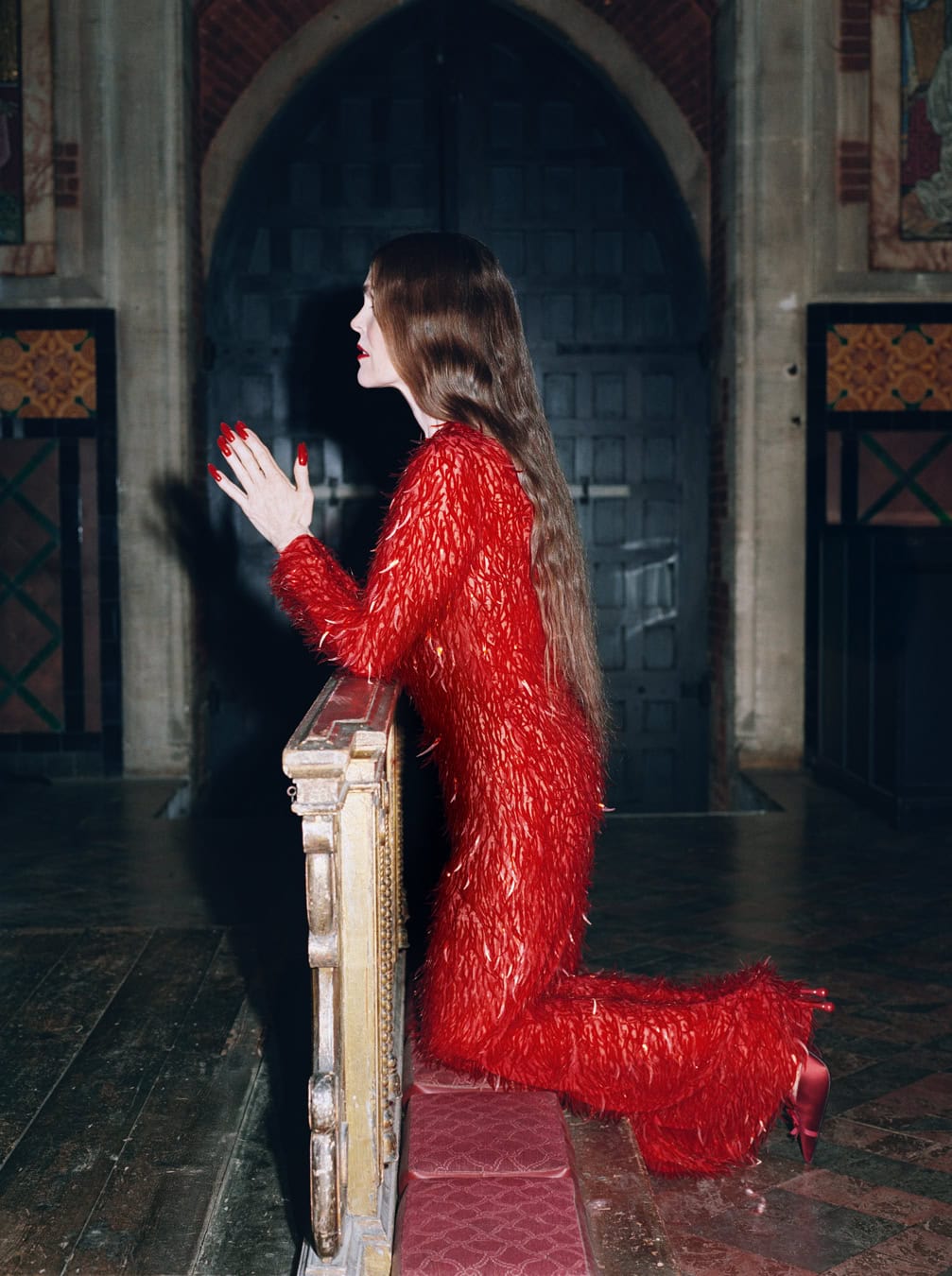 Linder says she isn’t happy in front of a camera, “although I know from working with photographic images how a human body sits within a rectangle of glass.” But she has been photographed by Paolo Roversi and Tim Walker, for example, so she’s experienced working with the medium’s most revered auteurs. For the shoot on these pages, with Linder wearing Ashish at St Mary Magdalene’s Church in Paddington, photographer Hazel Gaskin directed her subject to throw her head back, scream and laugh, break the silence of a space usually defined by contemplation and stillness. “In one of the shots I am wearing the top that says, ‘fresh hell’. It comes from the Dorothy Parker quote: ‘What fresh hell is this?’, which was her response to the phone or doorbell ringing,” she says. “The news cycle makes us feel like that the whole time now. Total anxiety. I’m 71 and this feels like the most fragile time for the planet I’ve experienced.”