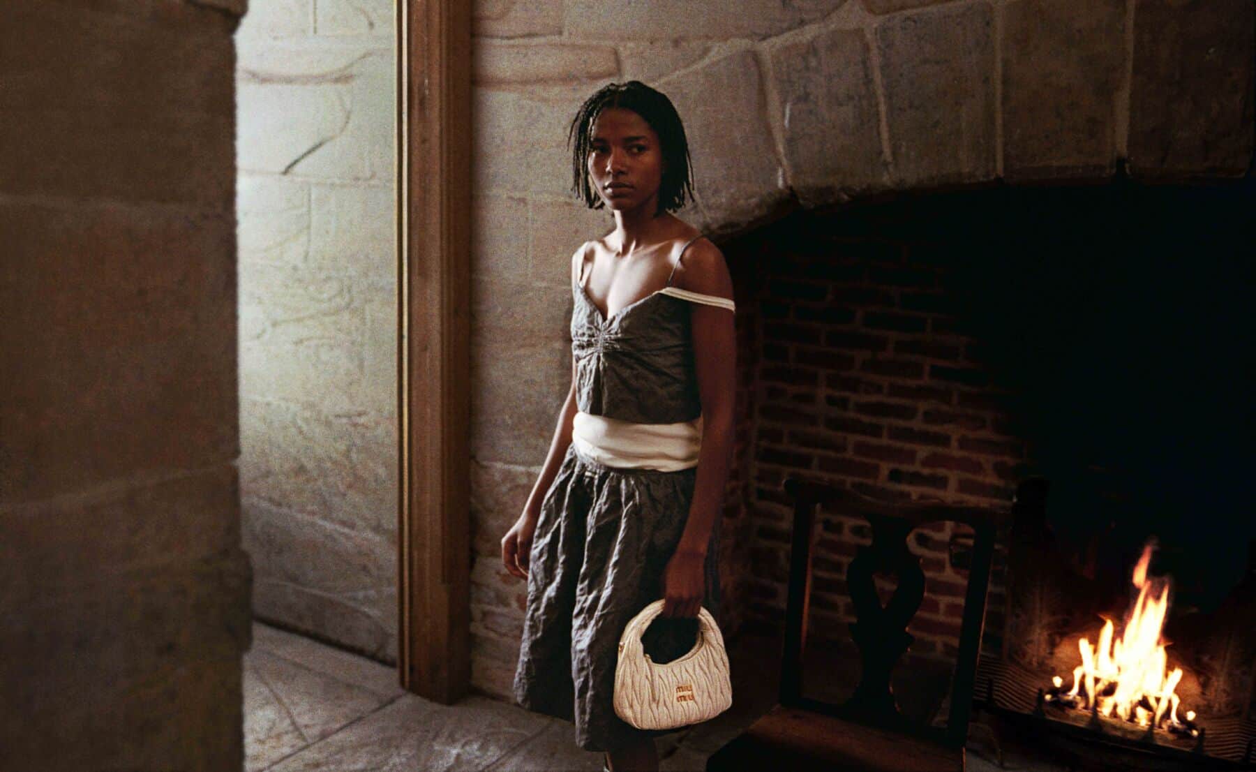 What could be cozier than sitting fireside in an Elizabethan manor house in the British countryside? That’s the setting for Miu Miu’s 2025 campaign. Starring the likes of Gigi Hadid, Dede Mansro, Viola Sharp, and Ju Xiaowen, photographer Angela Hill captures the cast on a Super 8 camera as well as film, lending a tinge of nostalgia to imagery. Clad in the season’s festive best, you’ll find crumpled and embroidered duchesse satins, patchworked shearling, glitter and sequin knits, and lingerie-inspired designs. Girlish and fresh, they serve as a counterpoint to the bricks and scarred stones that make up the home — a very Miu Miu way of finding beauty in the contrasts.