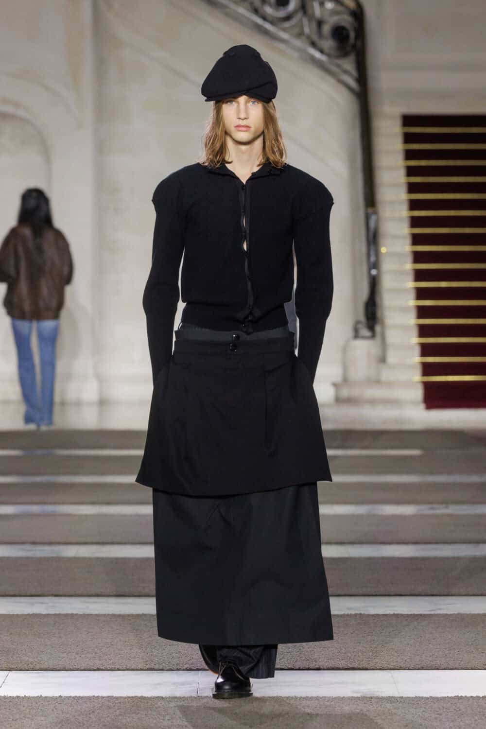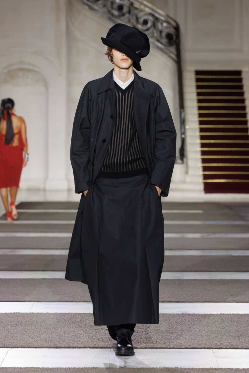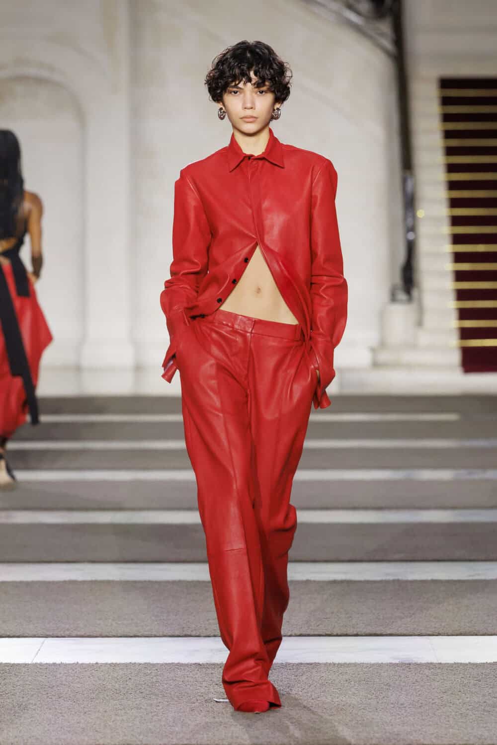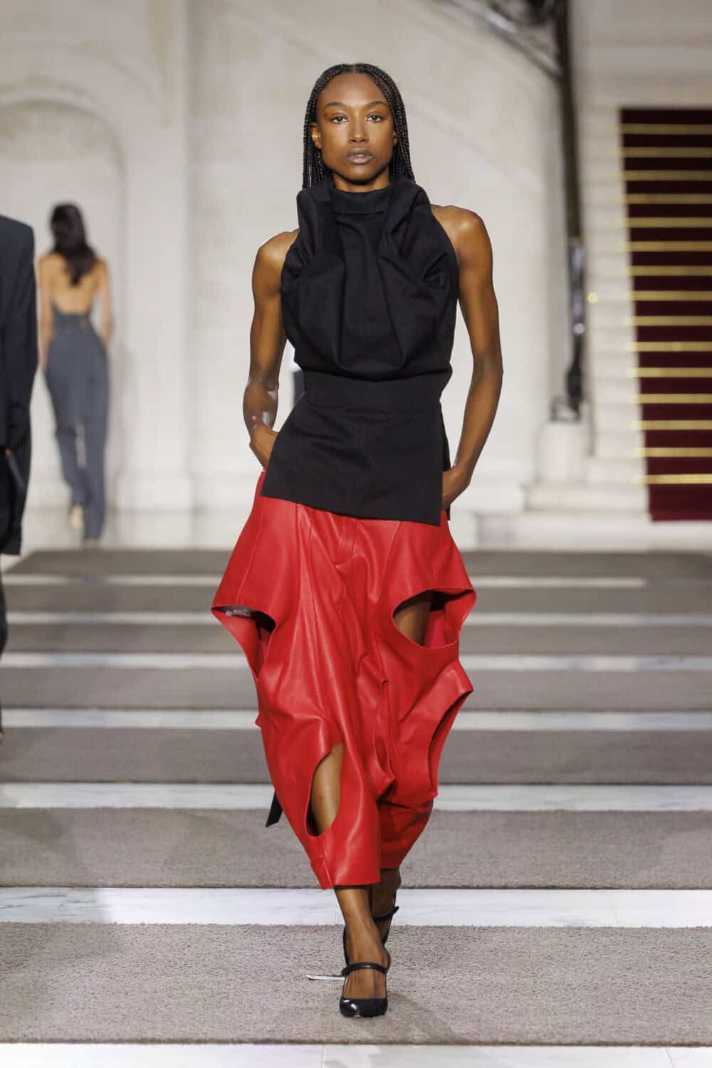 We saw skirts upon skirts, layered upon trousers casually falling off models’ hips with tailored suit jackets on top. A stunning crimson leather set appeared, a glaring light at the end of the mental spiral Torishéju was exploring. These were distorted school, military, industrial and work uniforms, where frayed edges and precise volume existed in a state of unexpected symbiosis. You had to look at them up close though, because even though they looked oh so familiar… something was off.