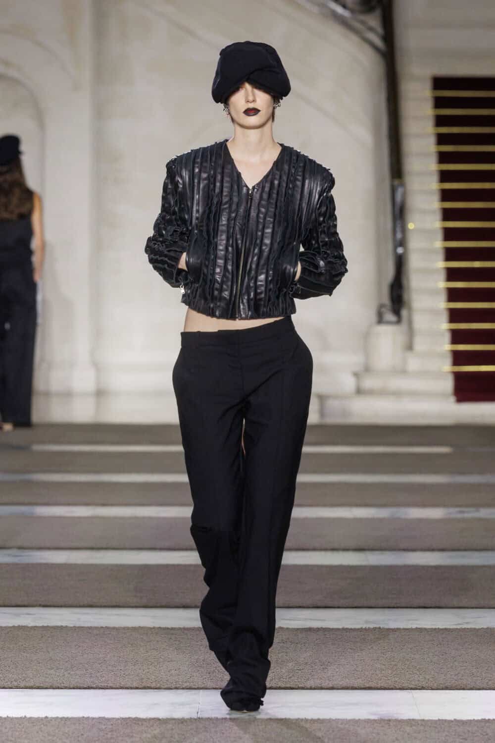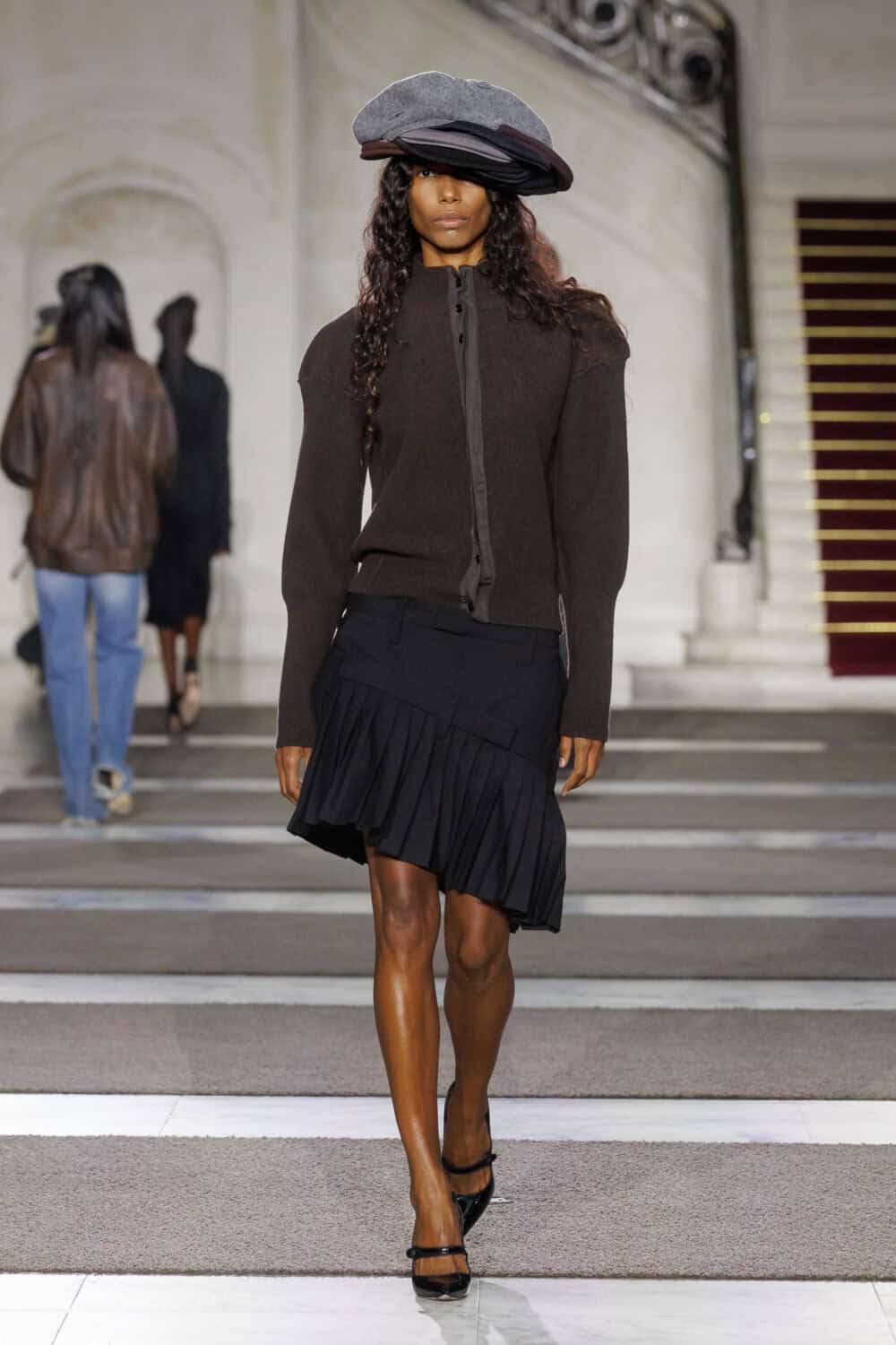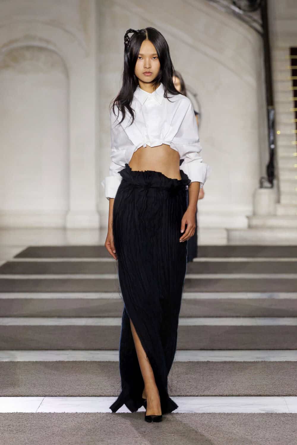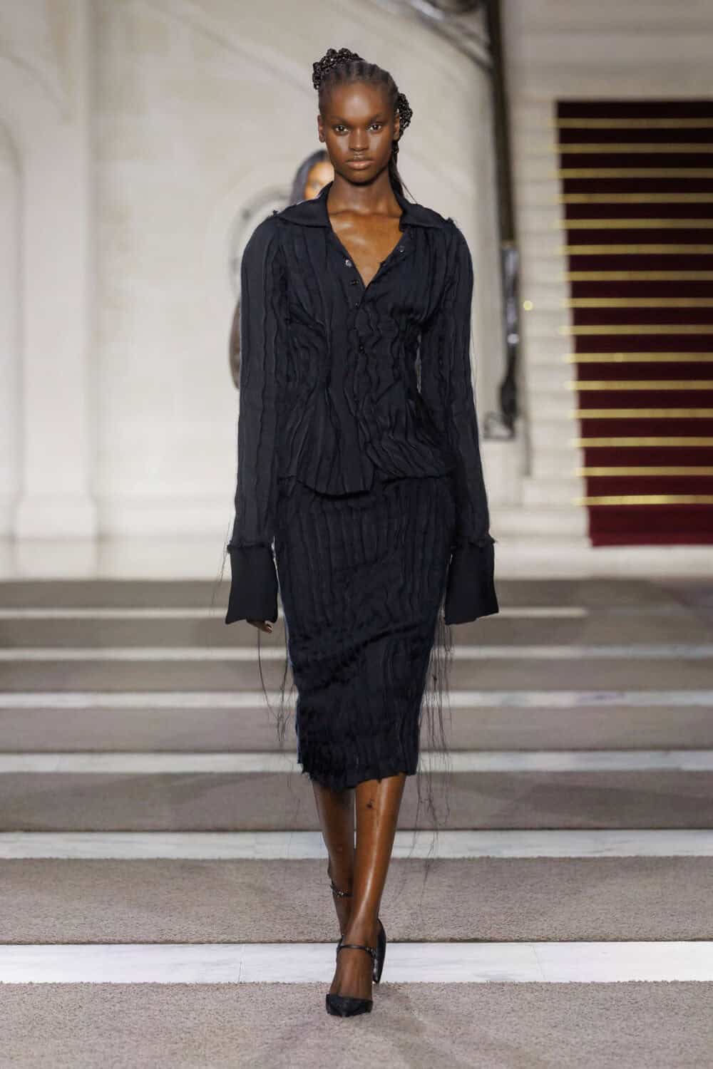 We saw skirts upon skirts, layered upon trousers casually falling off models’ hips with tailored suit jackets on top. A stunning crimson leather set appeared, a glaring light at the end of the mental spiral Torishéju was exploring. These were distorted school, military, industrial and work uniforms, where frayed edges and precise volume existed in a state of unexpected symbiosis. You had to look at them up close though, because even though they looked oh so familiar… something was off.