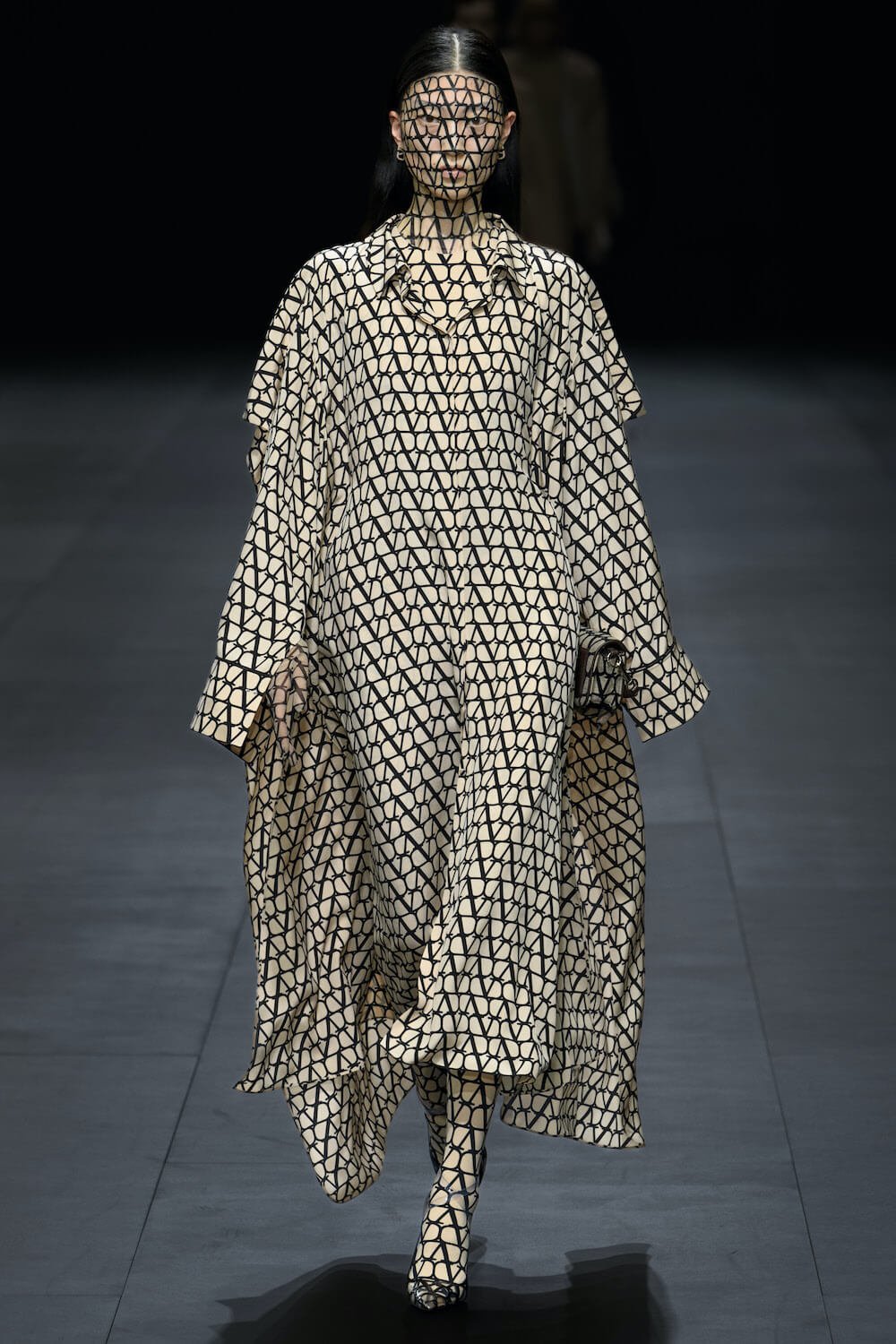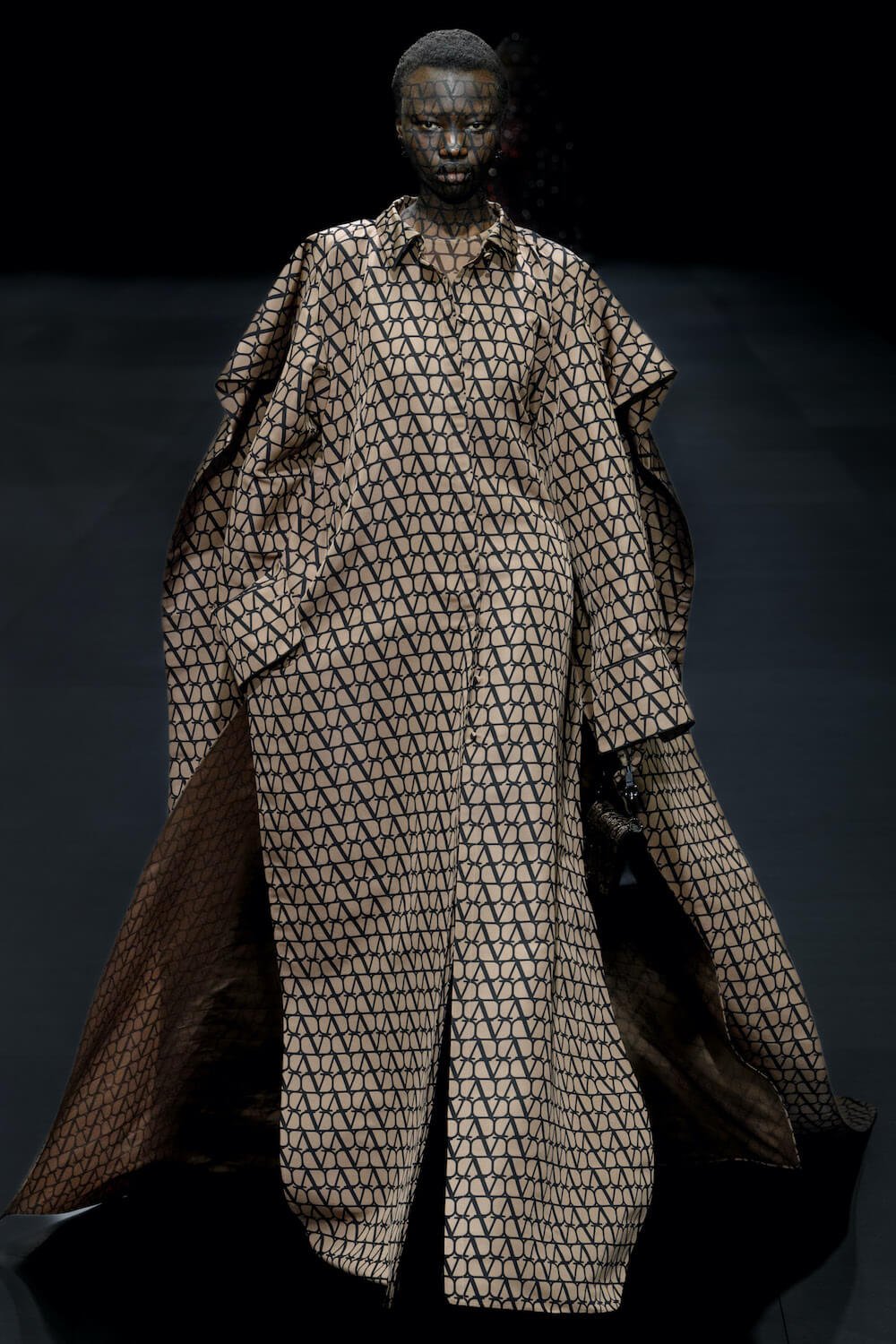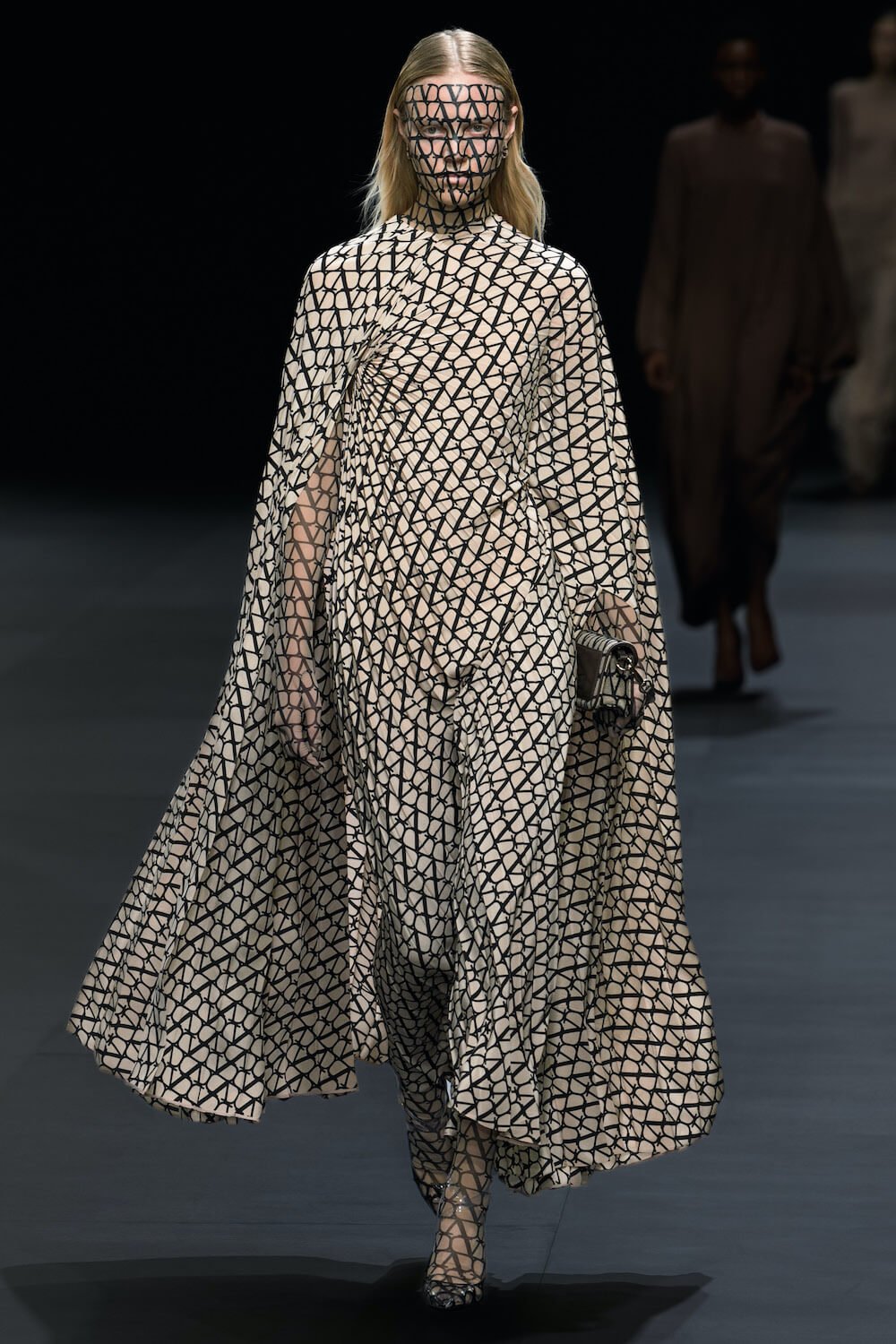 How would Pierpaolo Piccioli follow last season’s PP viral pink moment, when the Valentino world suddenly turned a startling shade of fuchsia? The answer was with logo mania. The house has only recently won a copyright battle and celebrated by splashing the ‘V’ monogram over everything from bags to flowing capes to tights and shoes. It was a head-to-toe approach. Even the models’ faces were artfully painted with the Valentino Toile Iconographe by Pat McGrath.