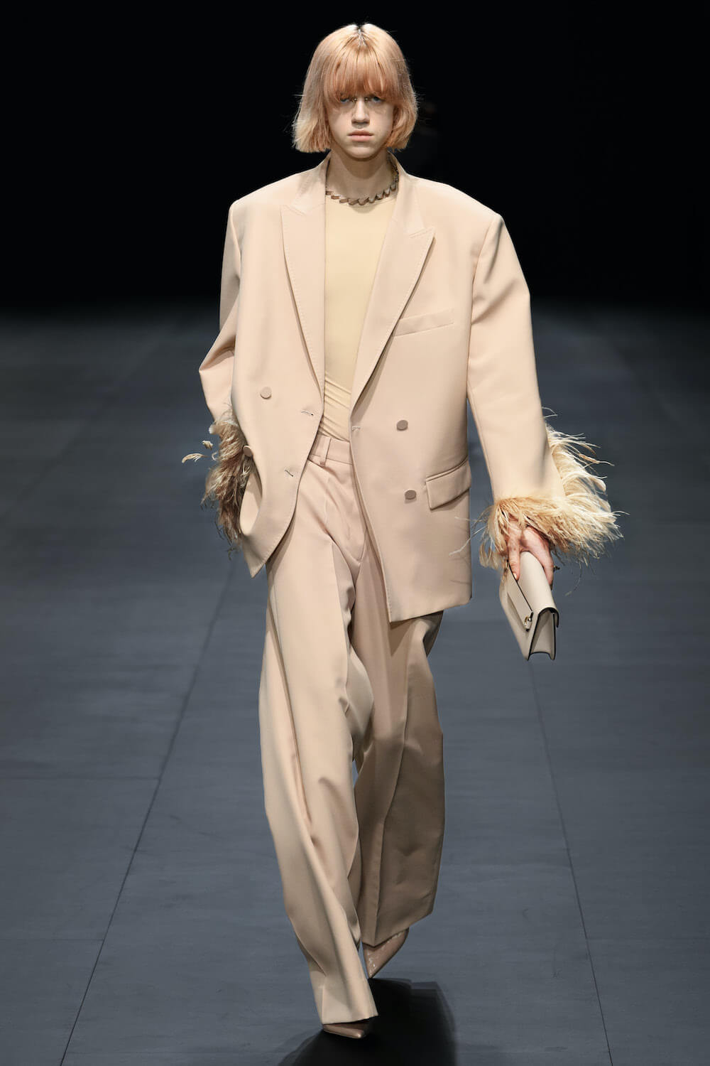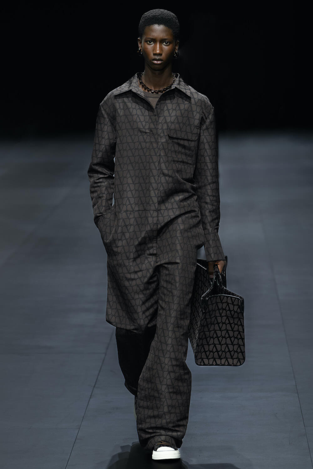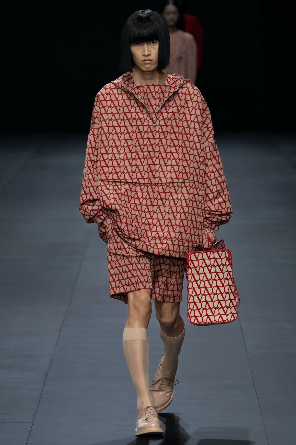How would Pierpaolo Piccioli follow last season’s PP viral pink moment, when the Valentino world suddenly turned a startling shade of fuchsia? The answer was with logo mania. The house has only recently won a copyright battle and celebrated by splashing the ‘V’ monogram over everything from bags to flowing capes to tights and shoes. It was a head-to-toe approach. Even the models’ faces were artfully painted with the Valentino Toile Iconographe by Pat McGrath.