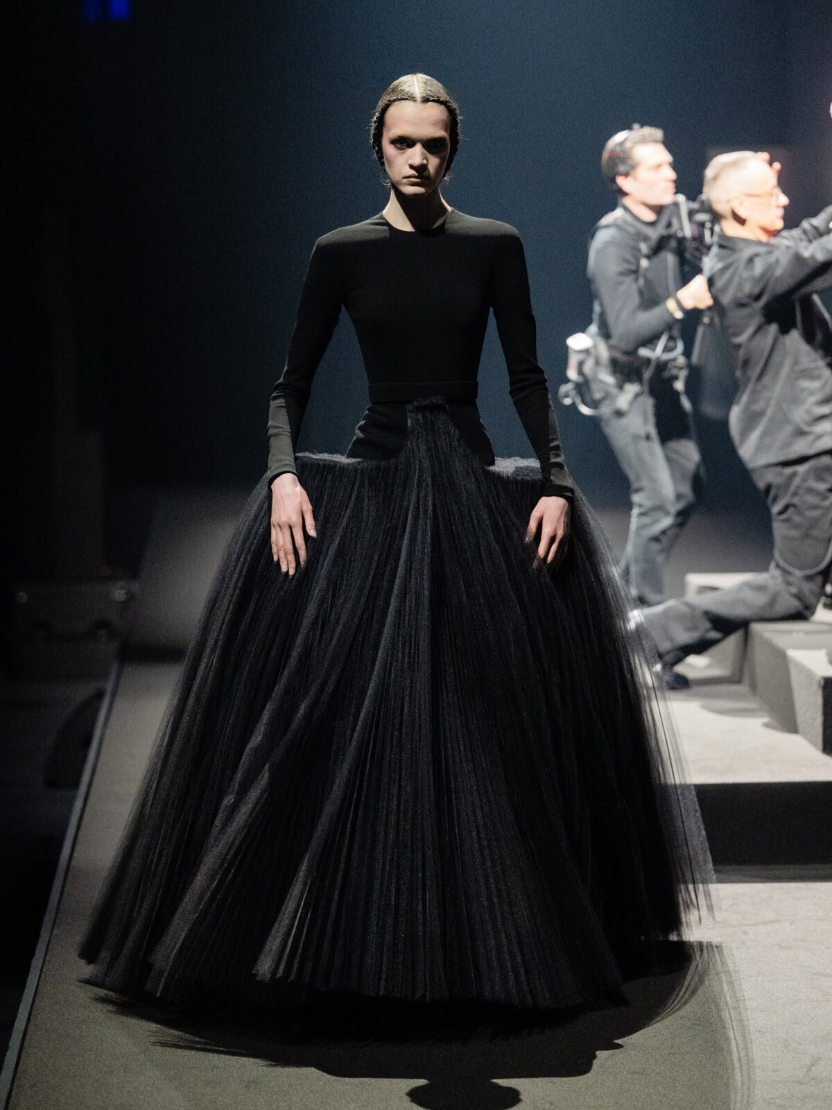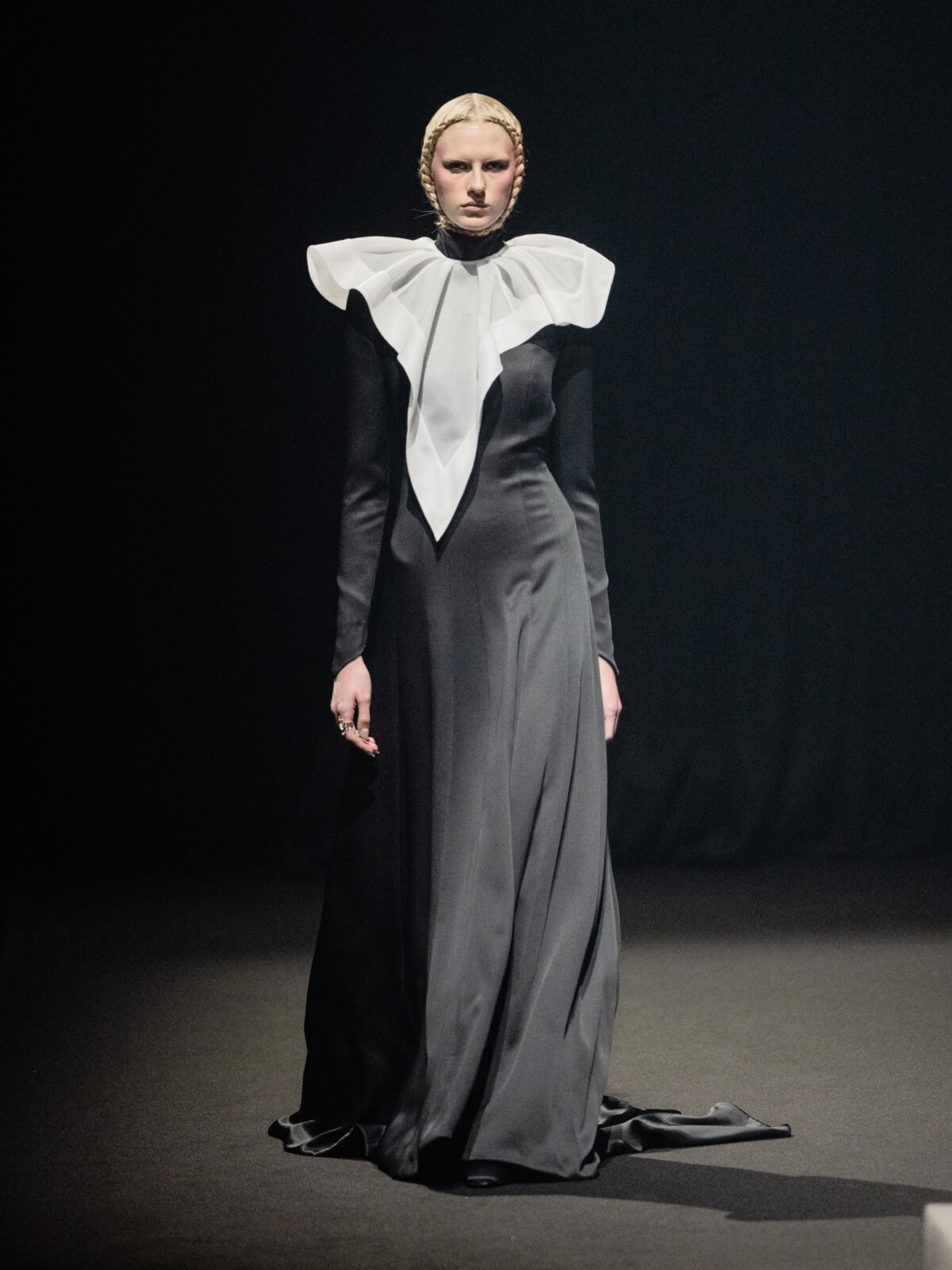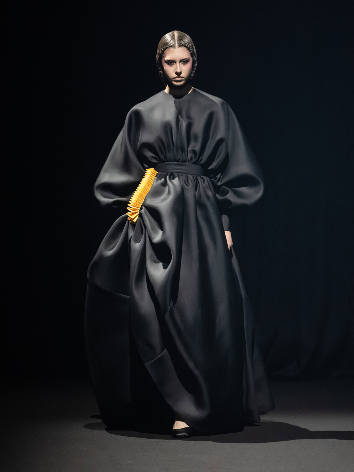 At Viktor & Rolf’s awe-inspiring SS26 couture show, the Dutch design duo quite literally built their final look in front of the fash pack – taking a single element from each look before it and applying it to a wondrously colourful, flying kite dress. Each preceding ensemble was jet black, zeroing in on silhouette, material and construction, but featured a single, technicolour attachment such as a collar, a cape, bow, rod or pannier. Then, live and in front of the audience, Viktor Horsting and Rolf Snoeren removed that effervescent element and applied it to the model behind them who was, at first, clad in a high-collar, belted, white minidress. Look after look – blousy gowns, floor-sweeping triangular gowns, structured maxi dresses – she transformed like a butterfly emerging from her cocoon, into a dramatic, show-stopping assemblage of neon hues that formed the shape of a kite – a symbol of cheer and levity. Eventually, she took flight, inciting a riotous chorus of oohs and aahs that cut through the sinister soundtrack like a rainbow might when it emerges through the clouds on a dreary day.