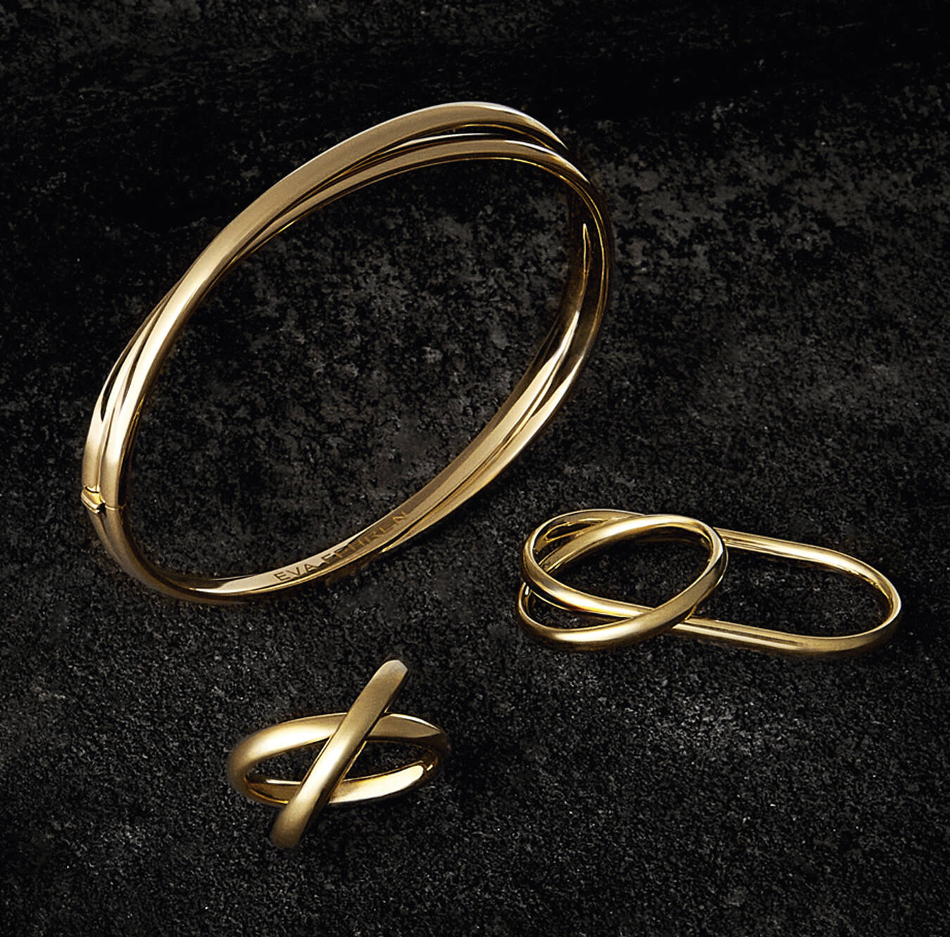 Eva Fehren, created by New Yorker Eva Zuckerman, revisited her ‘X’ designs using shiny yellow-gold tubing. The new look retains her tough-modern vibe while updating in the era of the Cartier Baignoire.