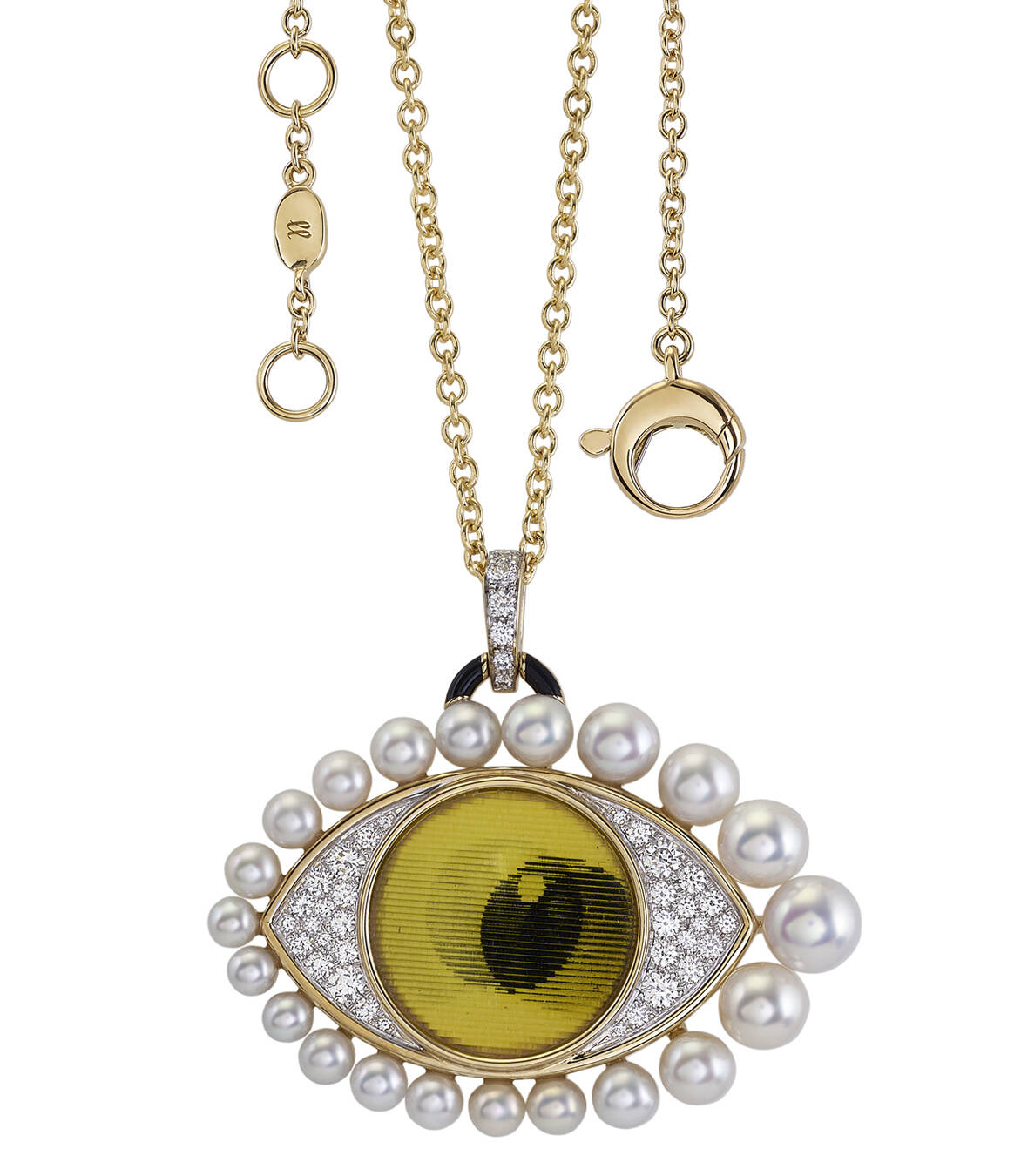 Villa took the Victorian lover’s-eye motif and playfully twisted it. The Italian replaced the eye paintings with cartoon lenticulars that open, close or shift direction, depending on the angle you are viewing them from. Then she surrounded them with traditional pearls and diamonds. The pieces are pretty, funny and adorable.
