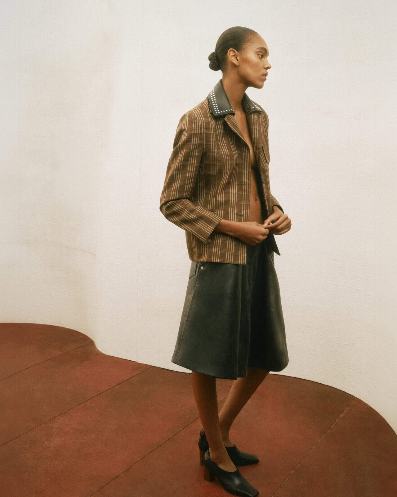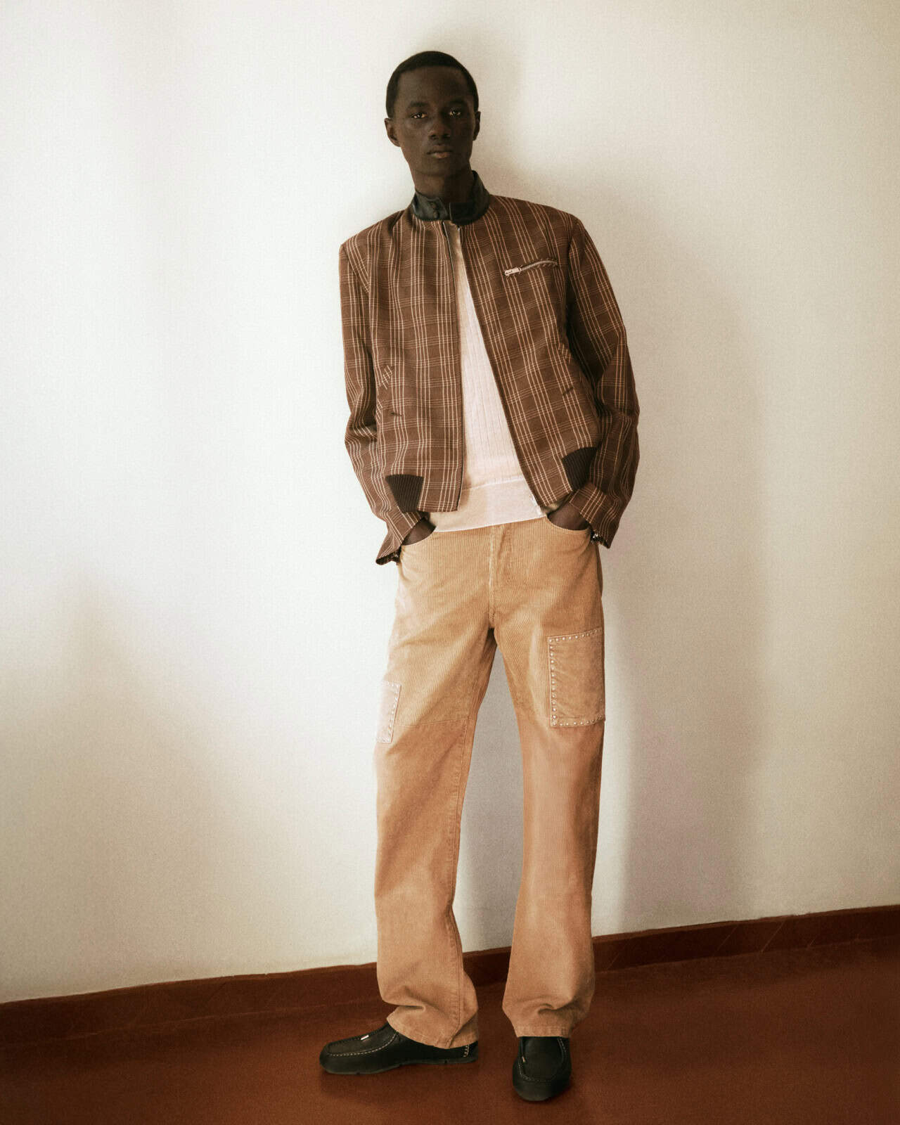Arriving months after Wales Bonner’s appointment as creative director of Hermès menswear (she’s set to debut in 2027), the collection feels assured rather than declarative. The lookbook, lensed by Malick Bodian and styled by Tom Guinness, presents an intimate vision of ease: hazy portraits wherein a ’70s colour palette of ivory, Atlantic blue and burnished browns soften the frame. Across the images, polos and flannels are cinched with satin sashes, Victorian tuxes are cut lighter and studded leather lapels bring a controlled edge.