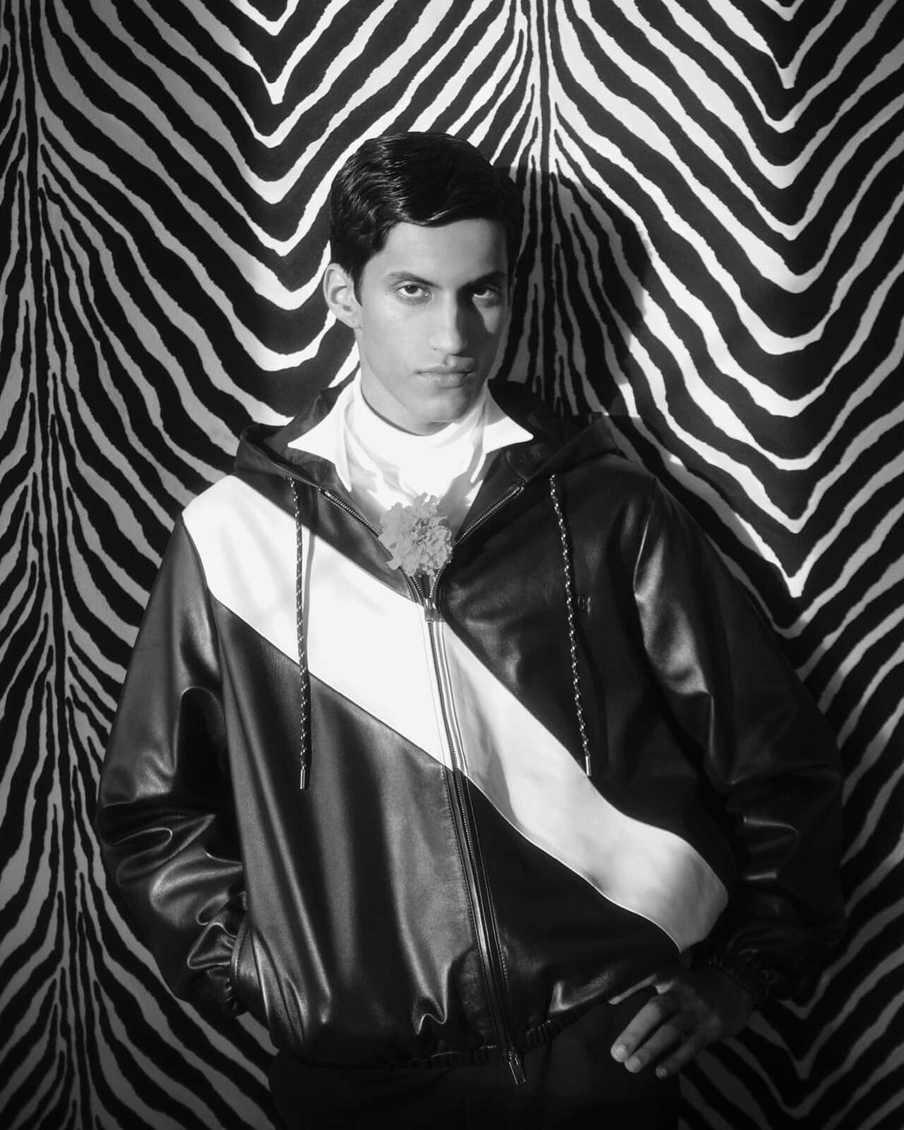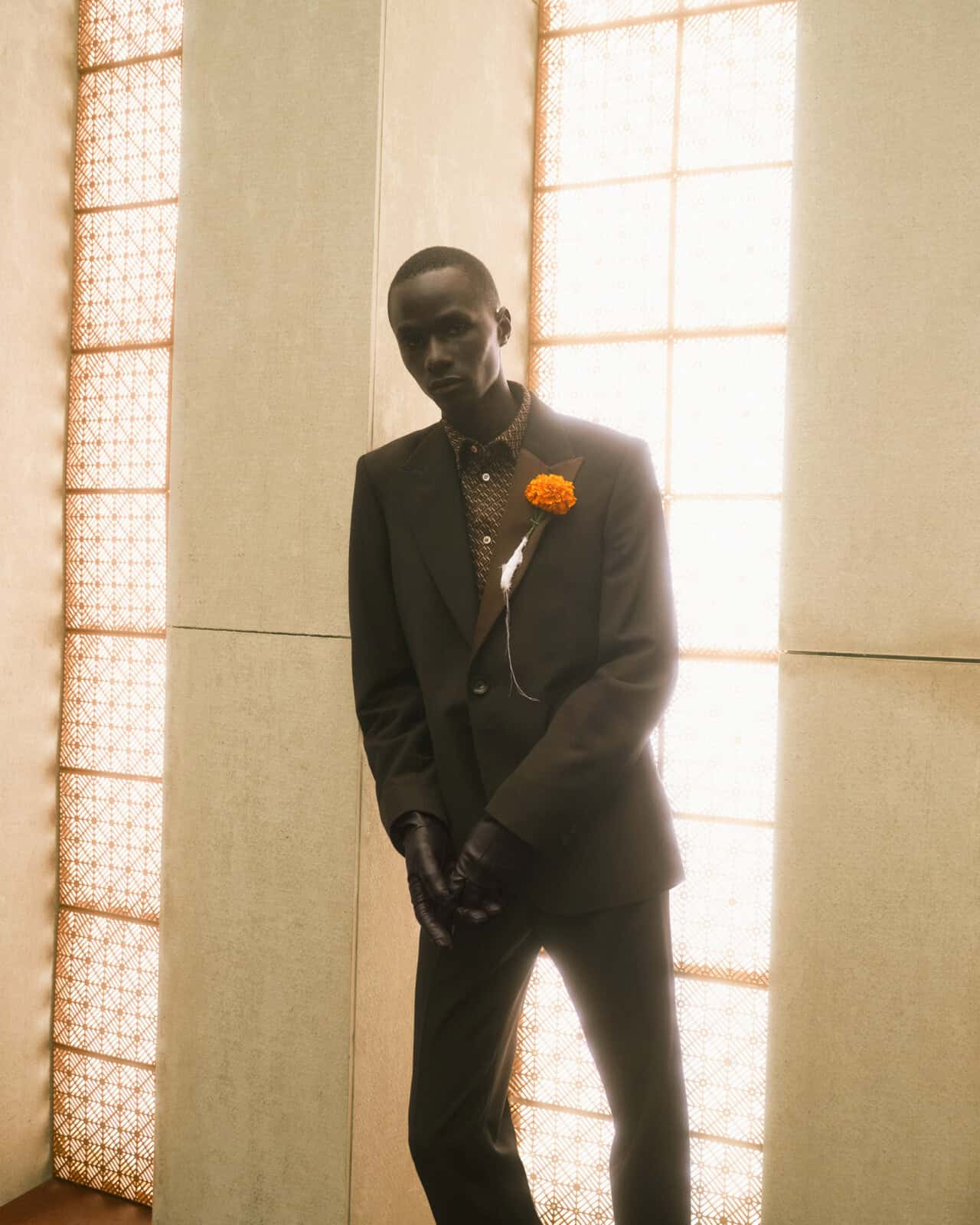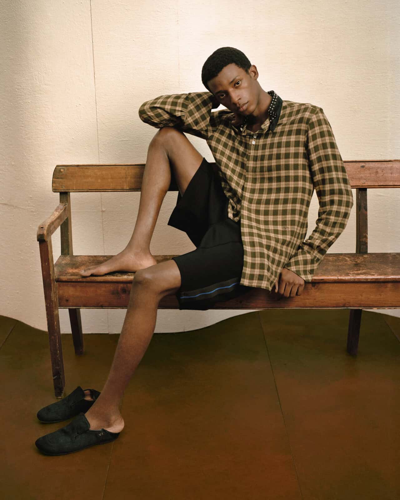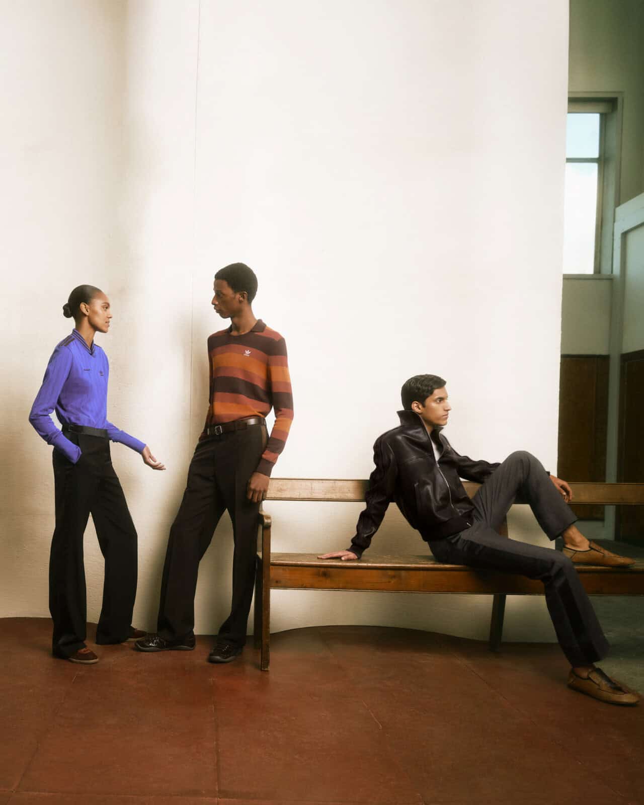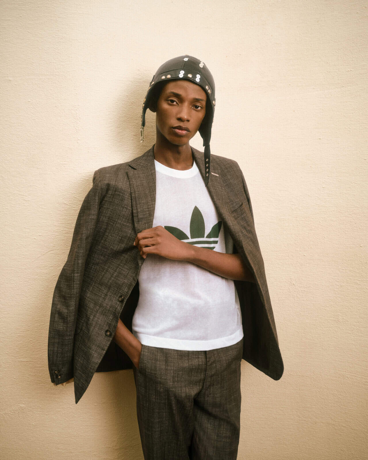Collaborations are integral. Adidas Originals anchors the offering with crocodile Karintha trainers and a new BW Army profile, while knits by John Smedley and tailoring by Anderson & Sheppard ground the collection in English craft. Architectural brooches carved from Panga Panga wood by Botswana-based Beullah Serema punctuate looks styled with fresh flowers for boutonnières. Footwear lands in zebra-print pony-hair Studio Moccasins, completing a collection that feels composed, tactile and quietly expansive.