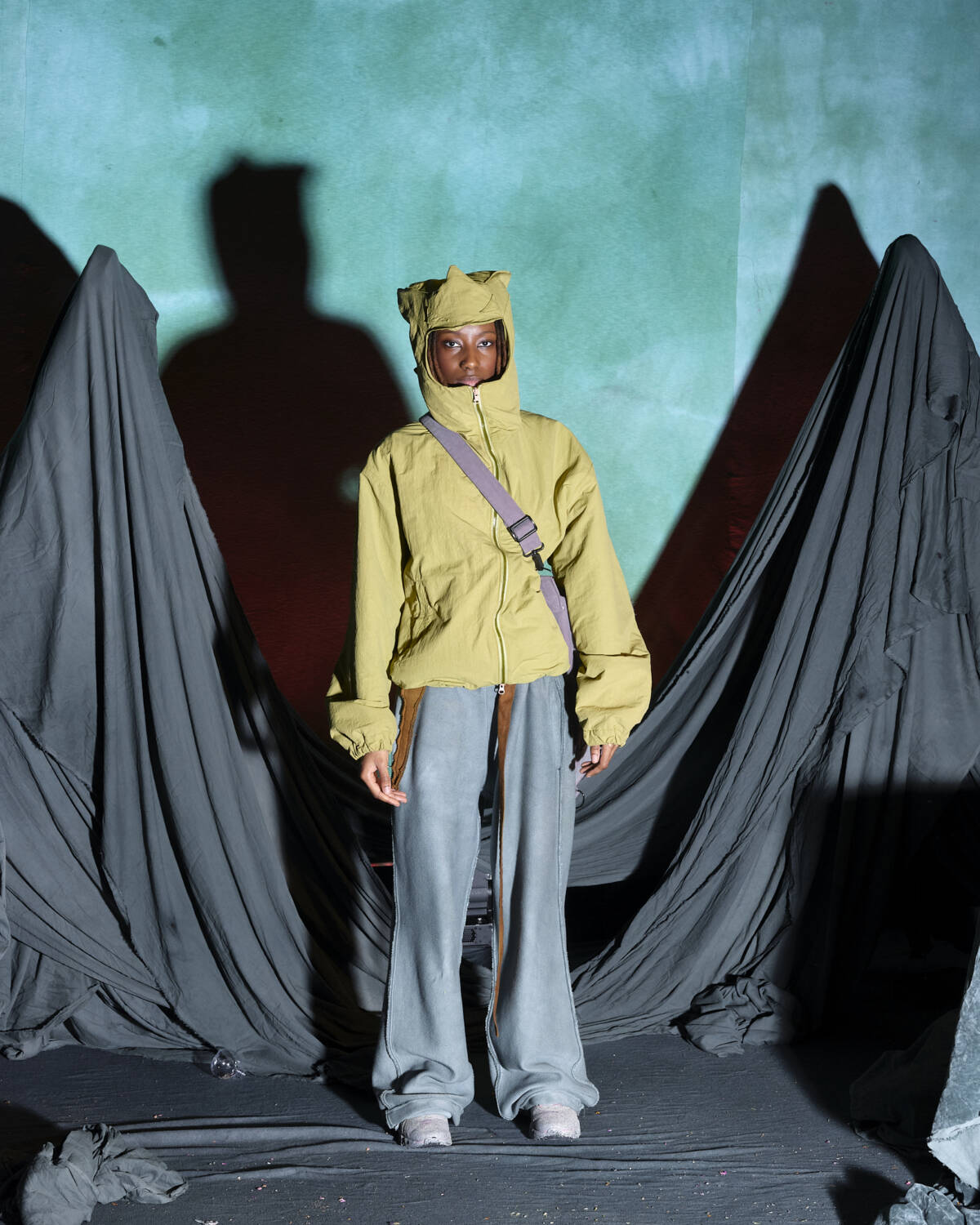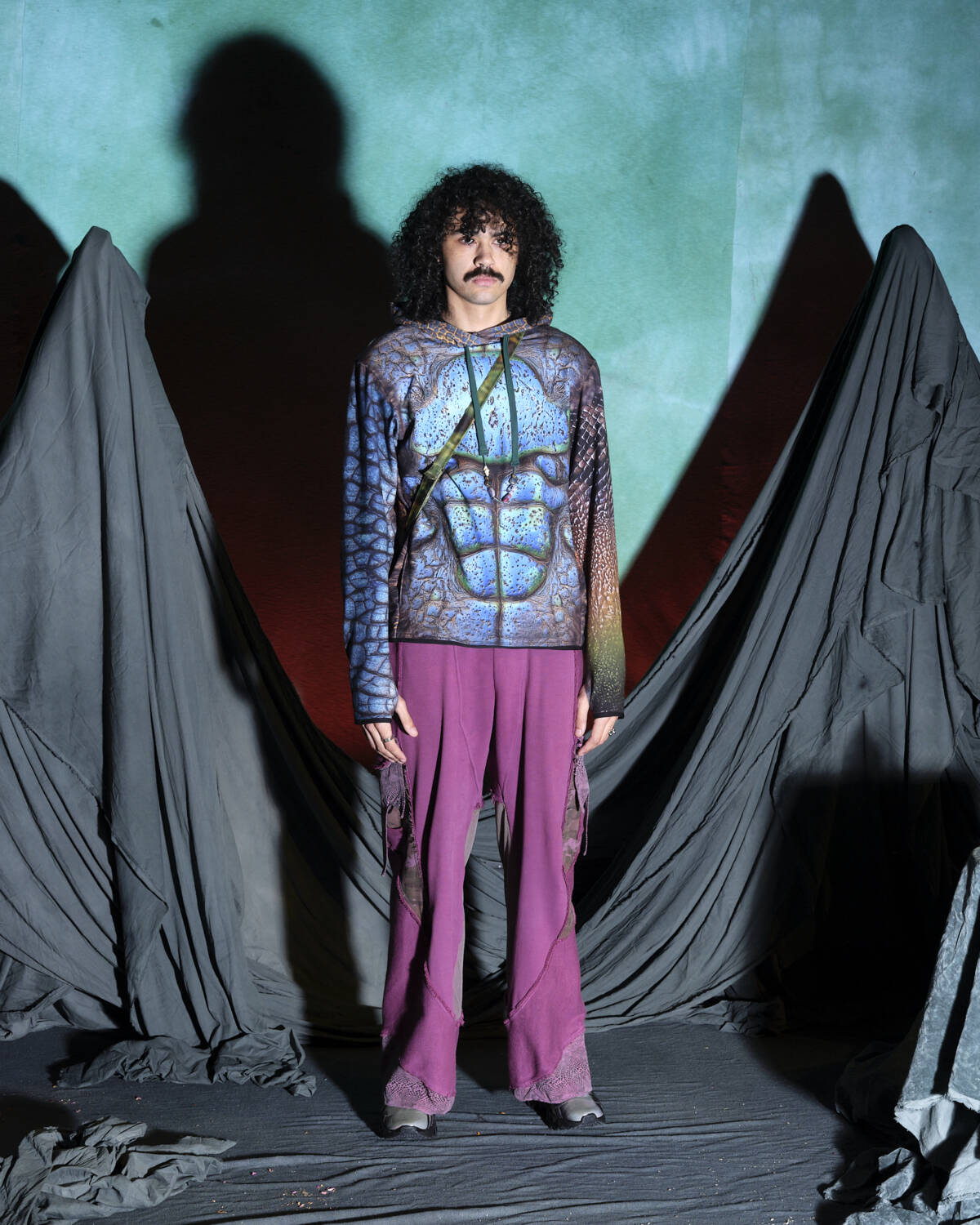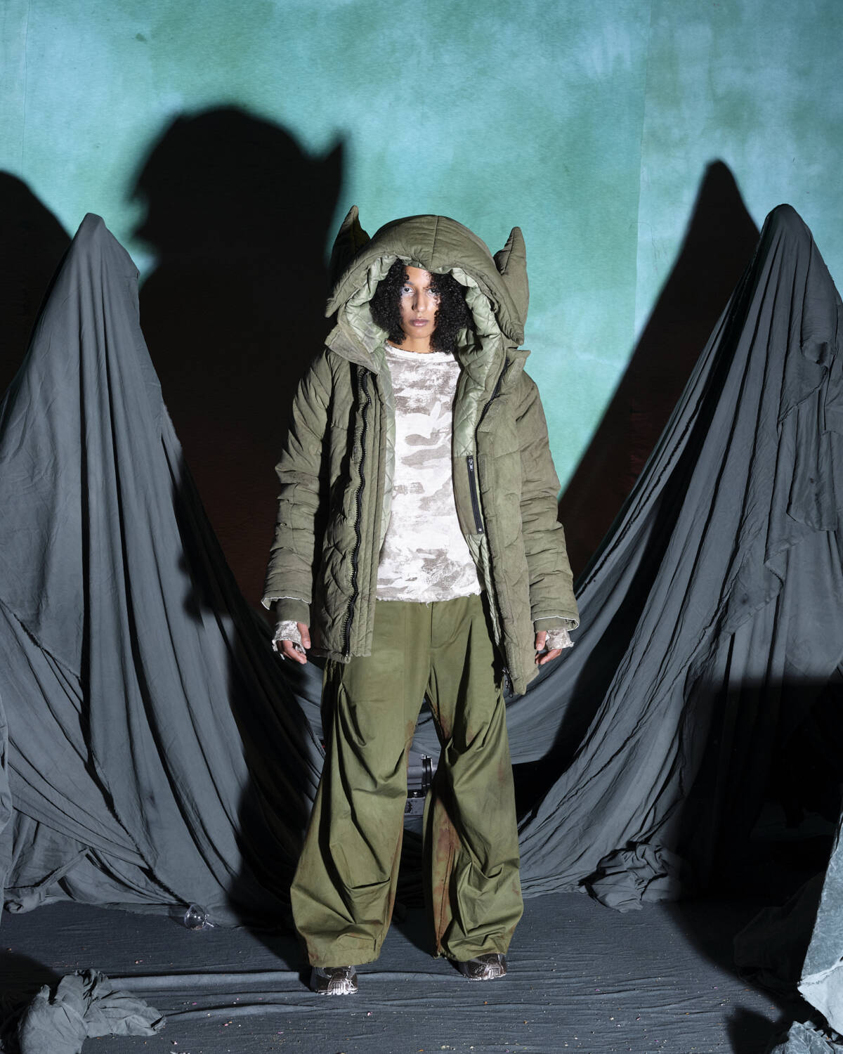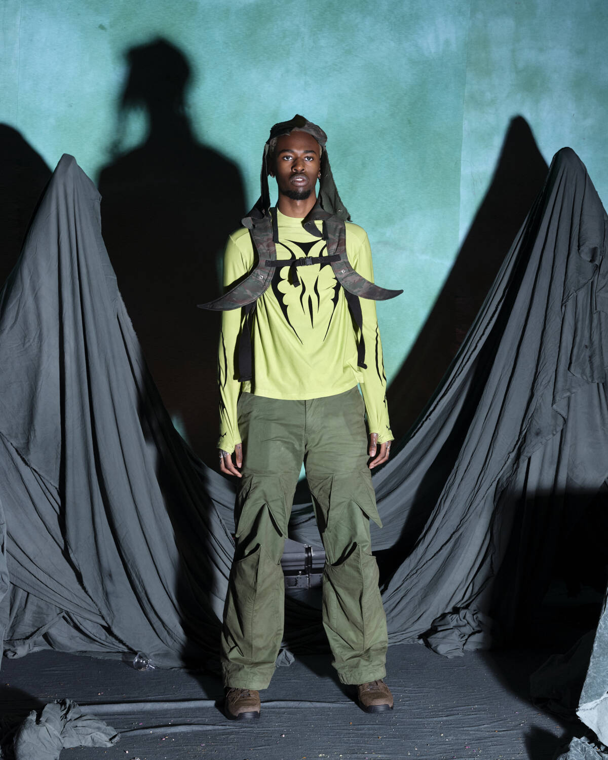Communicating a fully realised world, the presentation was titled Sunset on Tutorial Island and the garments, although only a part of the multidimensional experience, were very strong. Flavoured with the same video-game-esque aesthetics Stapleton has become recognised for, the silhouettes were relaxed, elevated in their details. Stapleton’s talent also lies in his ability to streamline such a textured world into pieces that feel genuinely wearable. Windbreaker jackets had their hoods stretched into horns, while puffy bombers featured 3D pectoral muscles and elbow pads. Loose-fitting, hand-dyed shorts were rugged and frayed, styled with very buyable graphic tees. Some of the louder pieces, like chunky coats with oversized, horned hoods still sit comfortably on the right side of the creative scale, avoiding the gimmicky trap some designers fall foul of. Yaku Stapleton is just getting started.