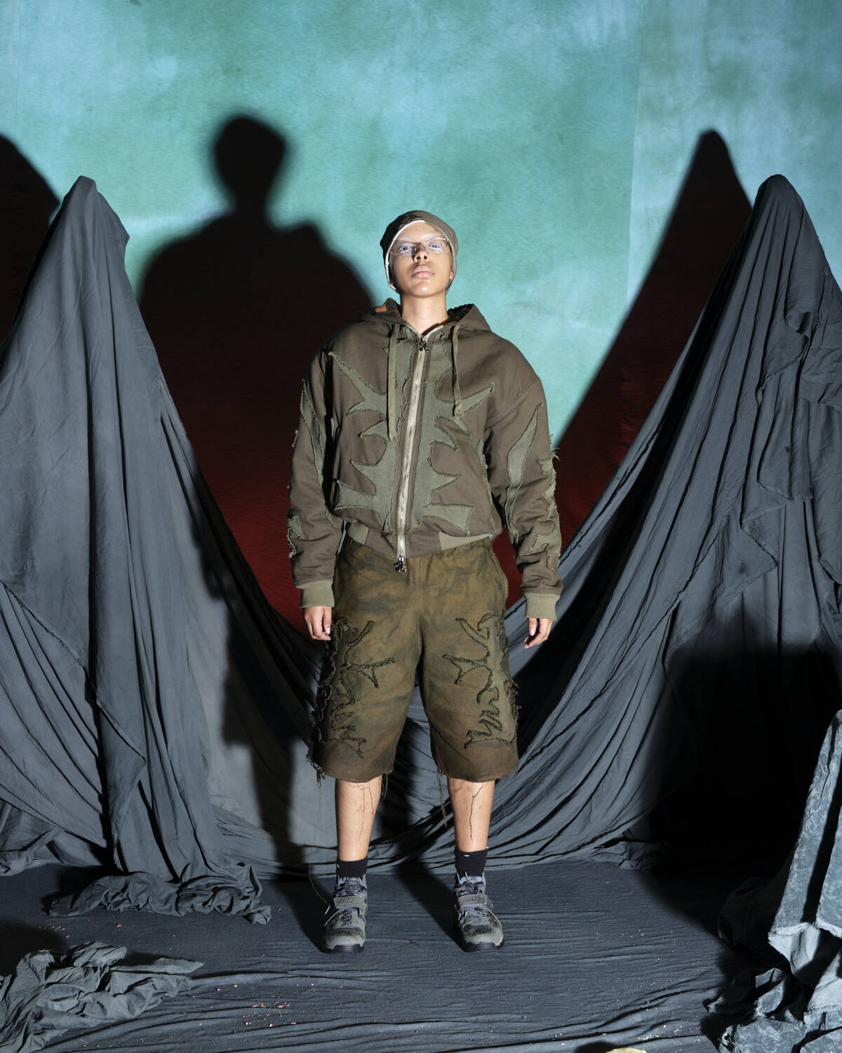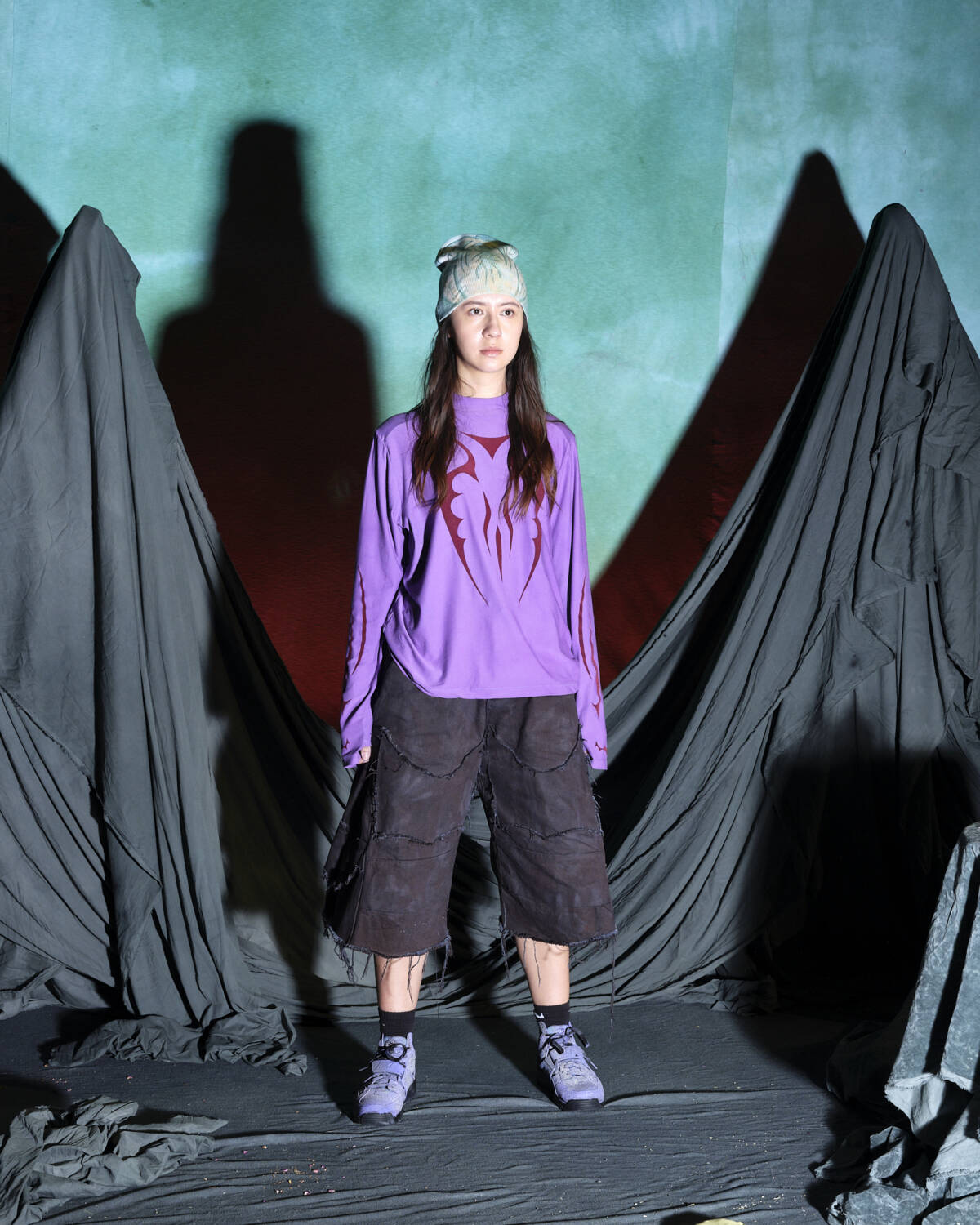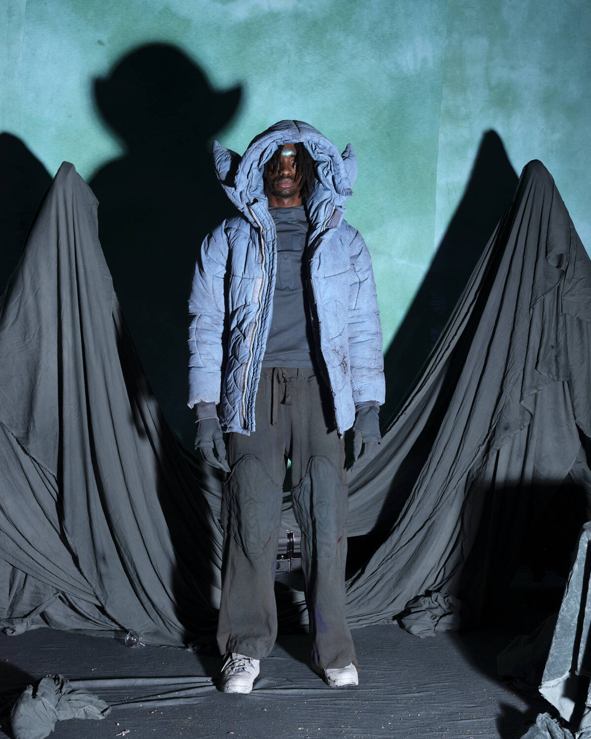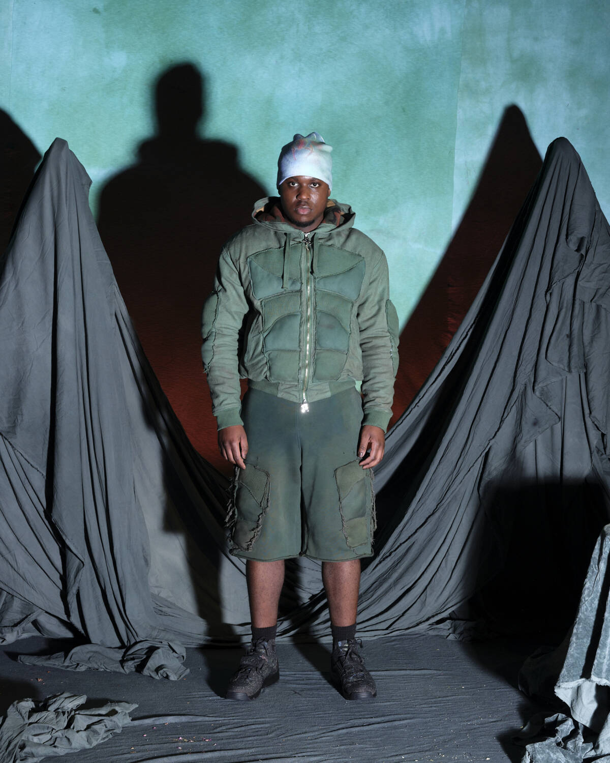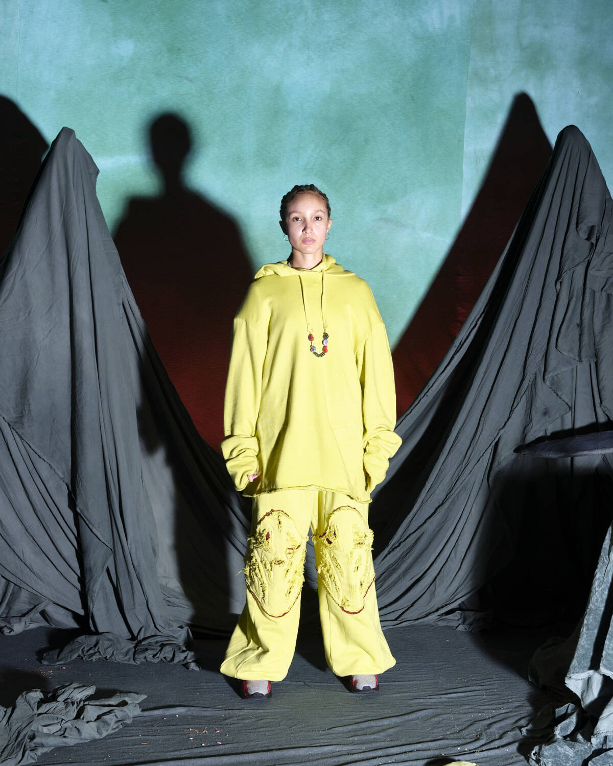 Communicating a fully realised world, the presentation was titled Sunset on Tutorial Island and the garments, although only a part of the multidimensional experience, were very strong. Flavoured with the same video-game-esque aesthetics Stapleton has become recognised for, the silhouettes were relaxed, elevated in their details. Stapleton’s talent also lies in his ability to streamline such a textured world into pieces that feel genuinely wearable. Windbreaker jackets had their hoods stretched into horns, while puffy bombers featured 3D pectoral muscles and elbow pads. Loose-fitting, hand-dyed shorts were rugged and frayed, styled with very buyable graphic tees. Some of the louder pieces, like chunky coats with oversized, horned hoods still sit comfortably on the right side of the creative scale, avoiding the gimmicky trap some designers fall foul of. Yaku Stapleton is just getting started.
