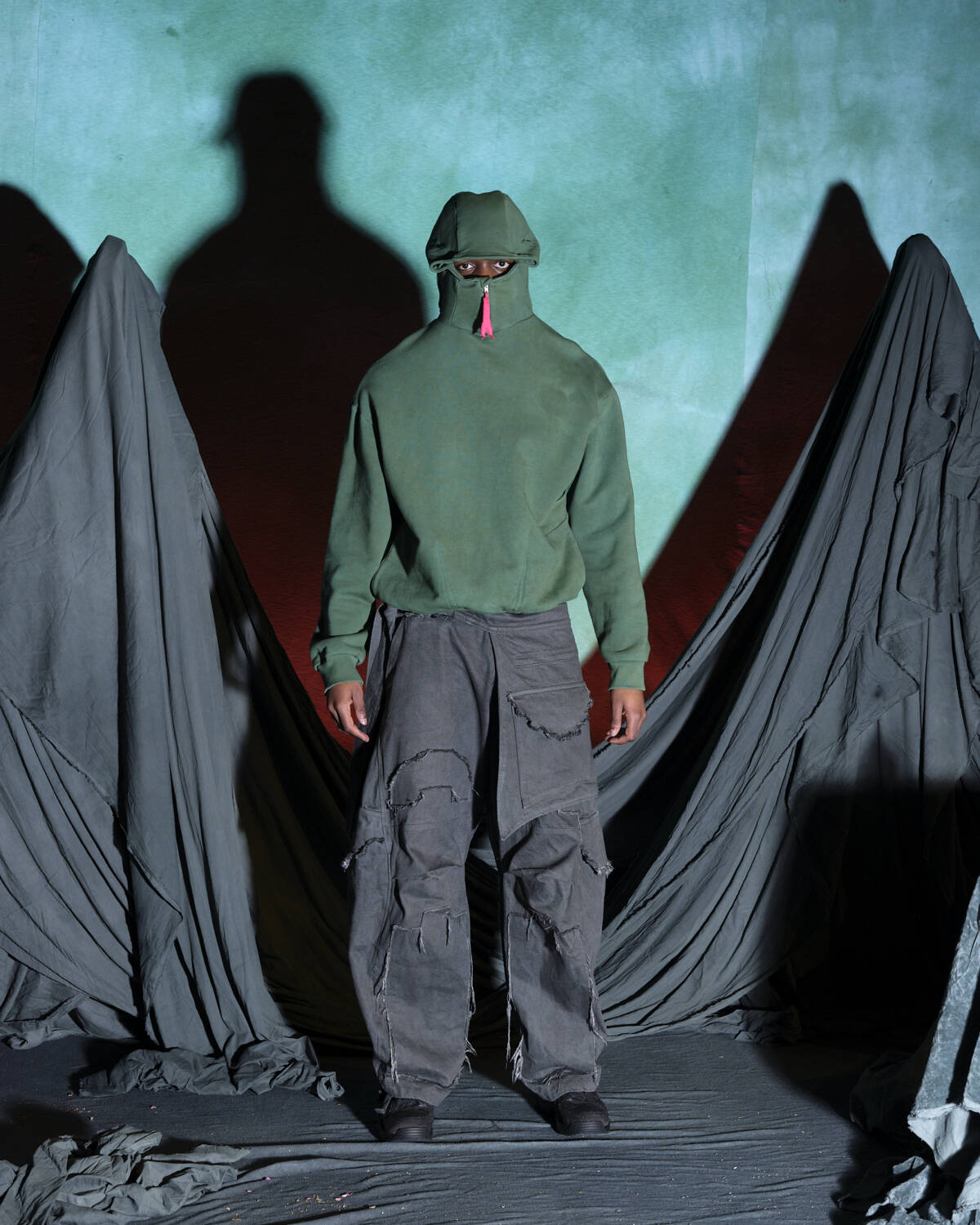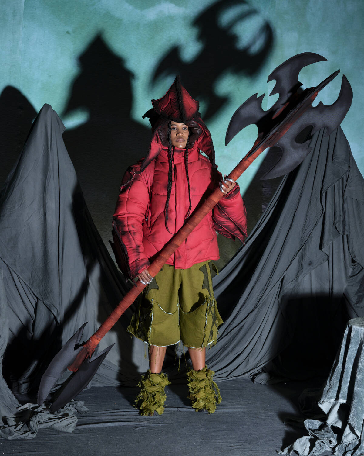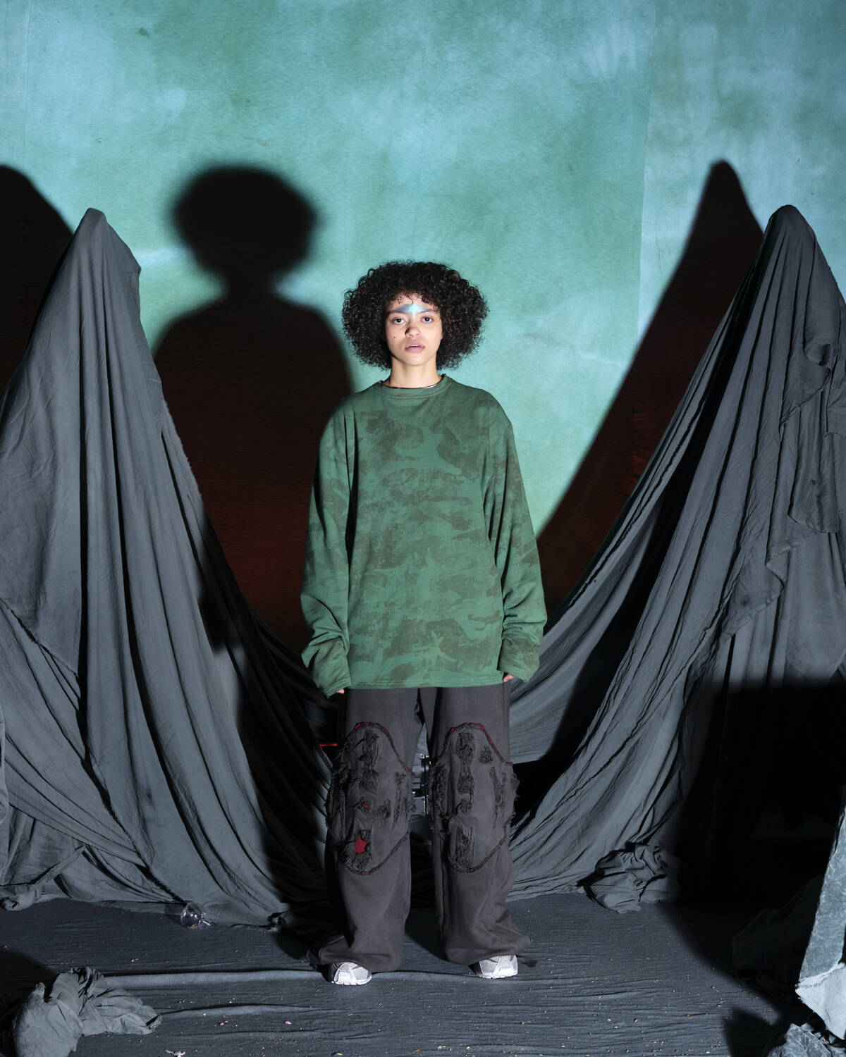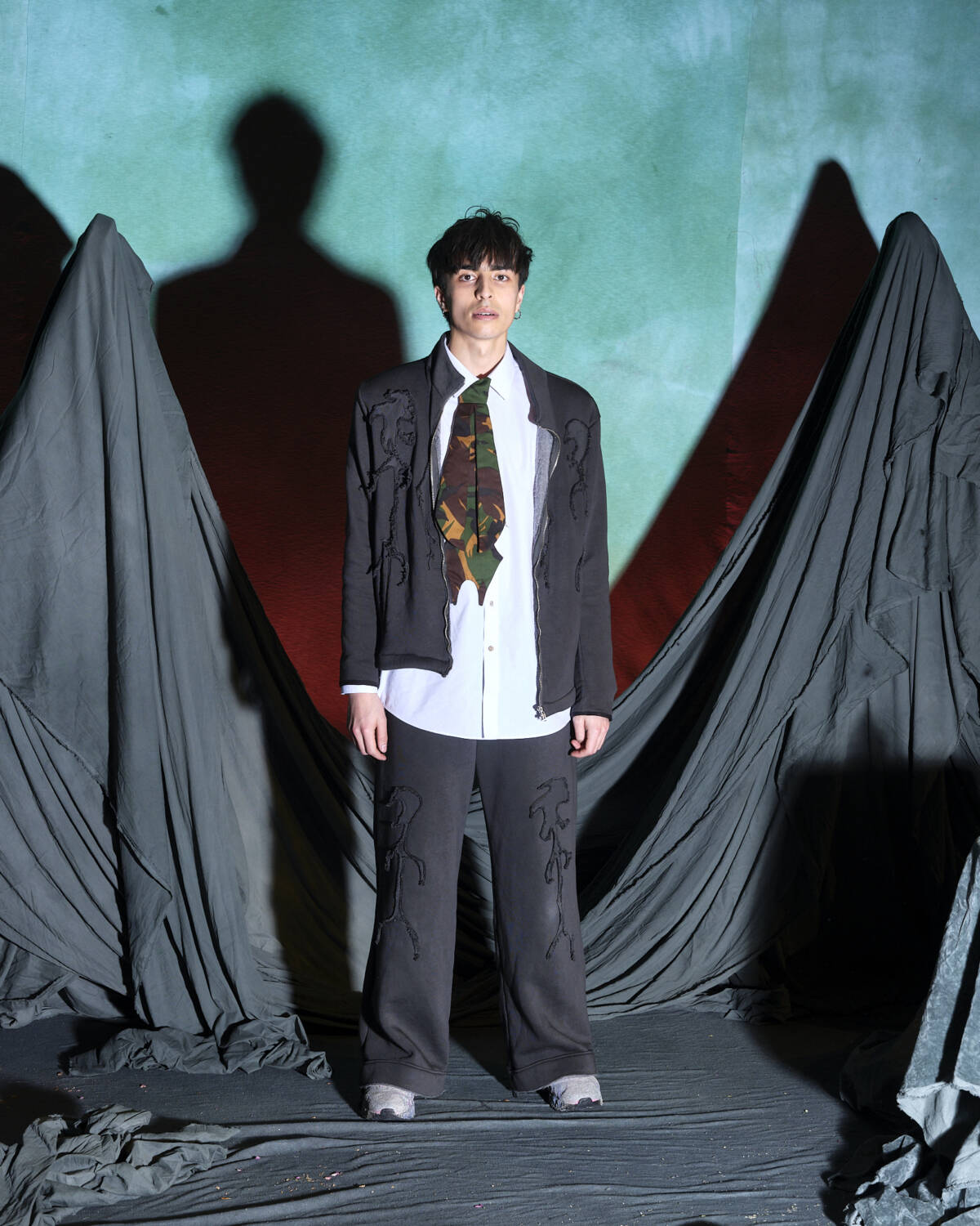 Communicating a fully realised world, the presentation was titled Sunset on Tutorial Island and the garments, although only a part of the multidimensional experience, were very strong. Flavoured with the same video-game-esque aesthetics Stapleton has become recognised for, the silhouettes were relaxed, elevated in their details. Stapleton’s talent also lies in his ability to streamline such a textured world into pieces that feel genuinely wearable. Windbreaker jackets had their hoods stretched into horns, while puffy bombers featured 3D pectoral muscles and elbow pads. Loose-fitting, hand-dyed shorts were rugged and frayed, styled with very buyable graphic tees. Some of the louder pieces, like chunky coats with oversized, horned hoods still sit comfortably on the right side of the creative scale, avoiding the gimmicky trap some designers fall foul of. Yaku Stapleton is just getting started.