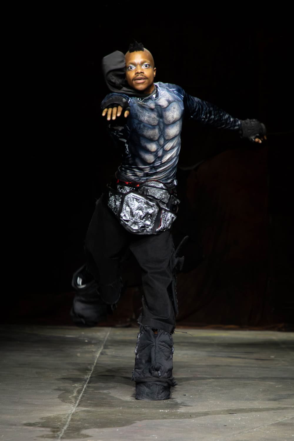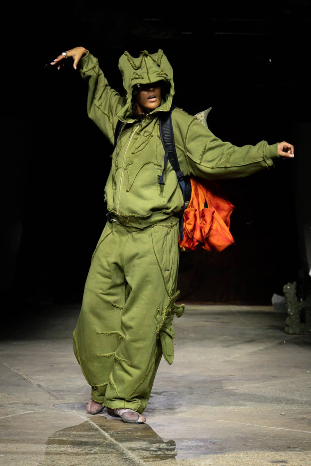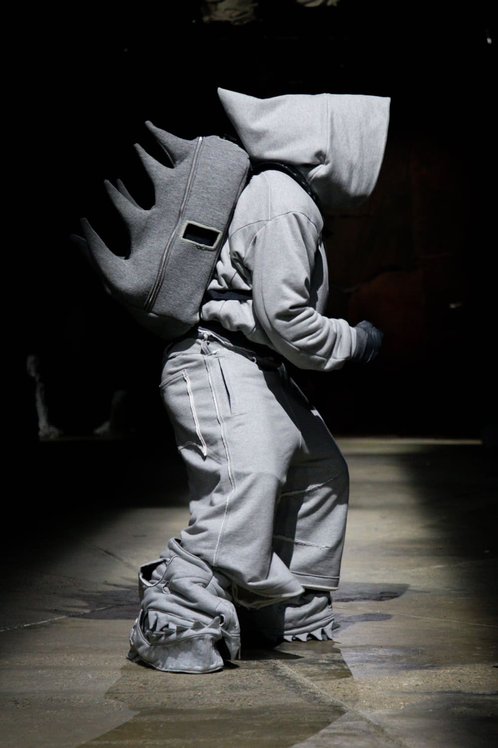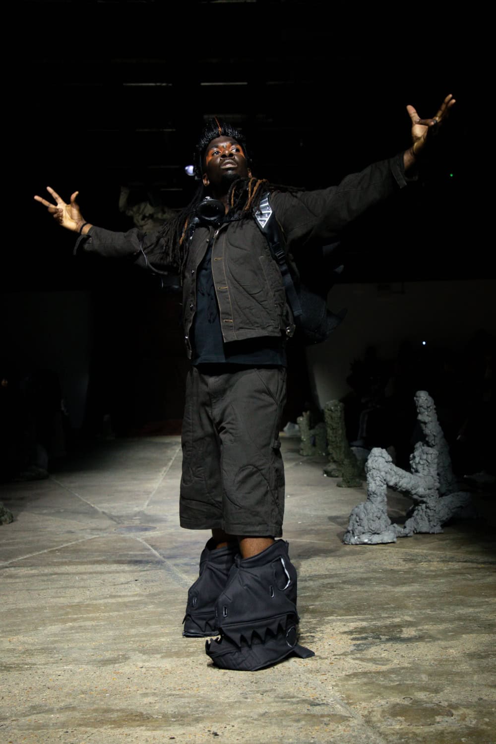 Entitled The Possible Family Reunion in RPG Space, the offering leaned on the brand’s go-to codes but with a flare for the dramatic. Dressed in oversized hoodies and rounded, moon-boot-like stompers, the models-cum-actors pulsed, popped, split and posed their way down the runway in a catwalk-like structure, despite Yaku being booked on the schedule for a presentation. It was smart – the Yaku team organised rough installments, so they could technically do a show multiple times over. It’s to be expected, Yaku is smart. You can see it in the details. Spikey game consoles, Bowser-esque backpacks, bow and arrows, faceless warriors suspended from the ceiling – the young talent knows how to tell a rich story. And AW26 left us keen to turn the page to find out what’s next.