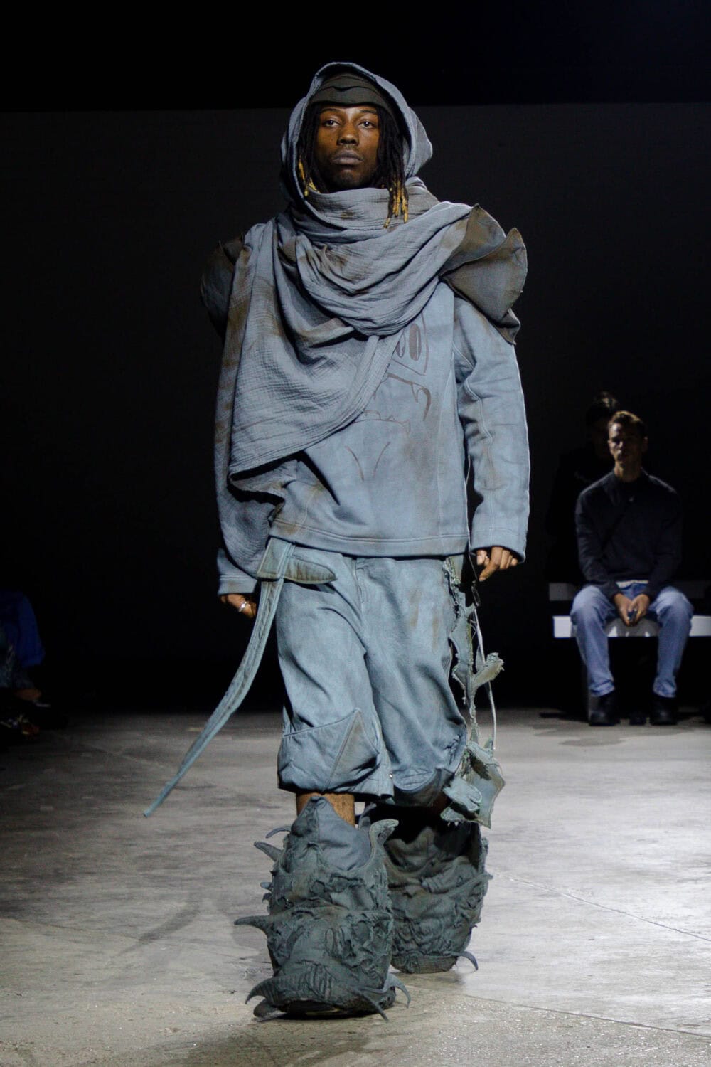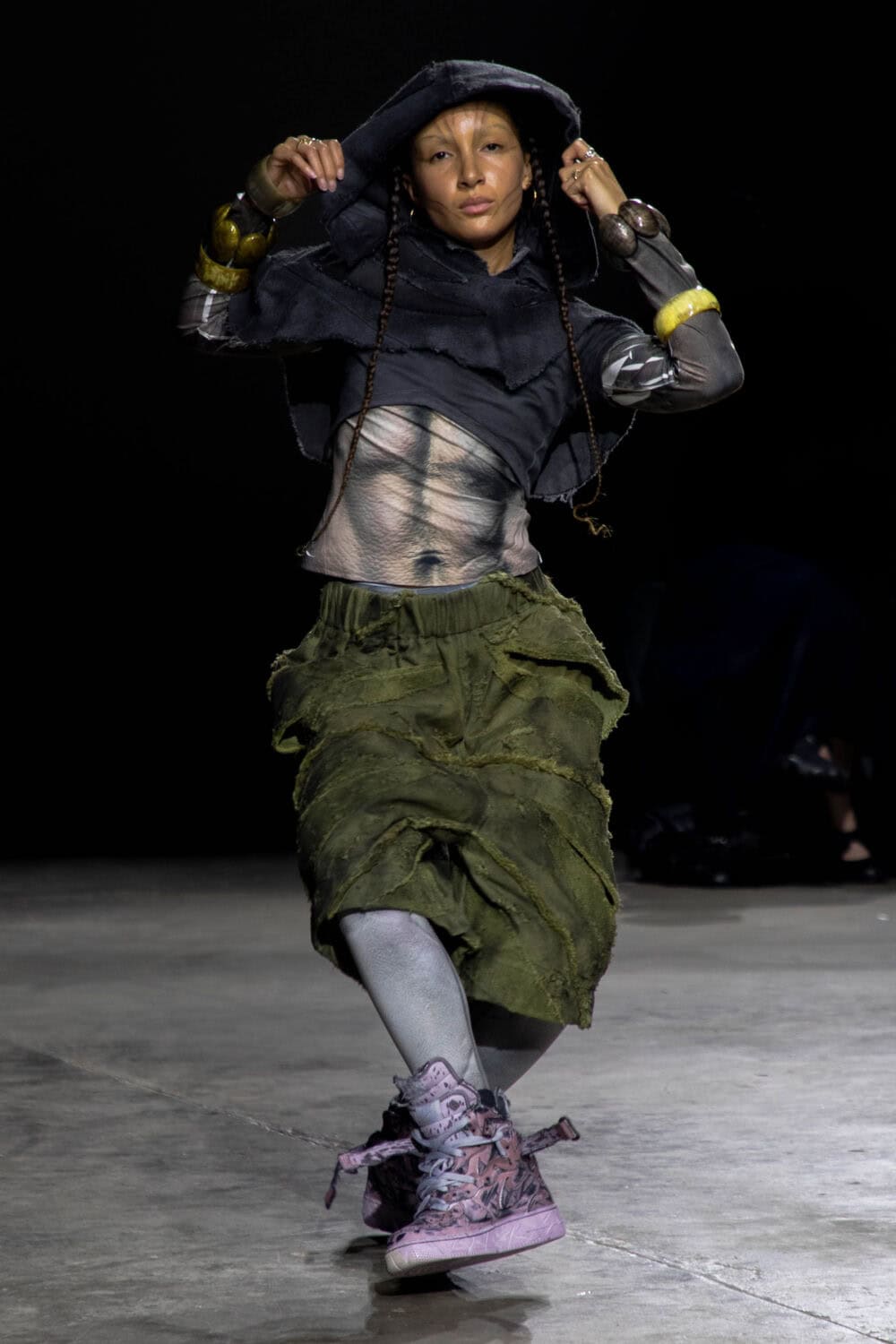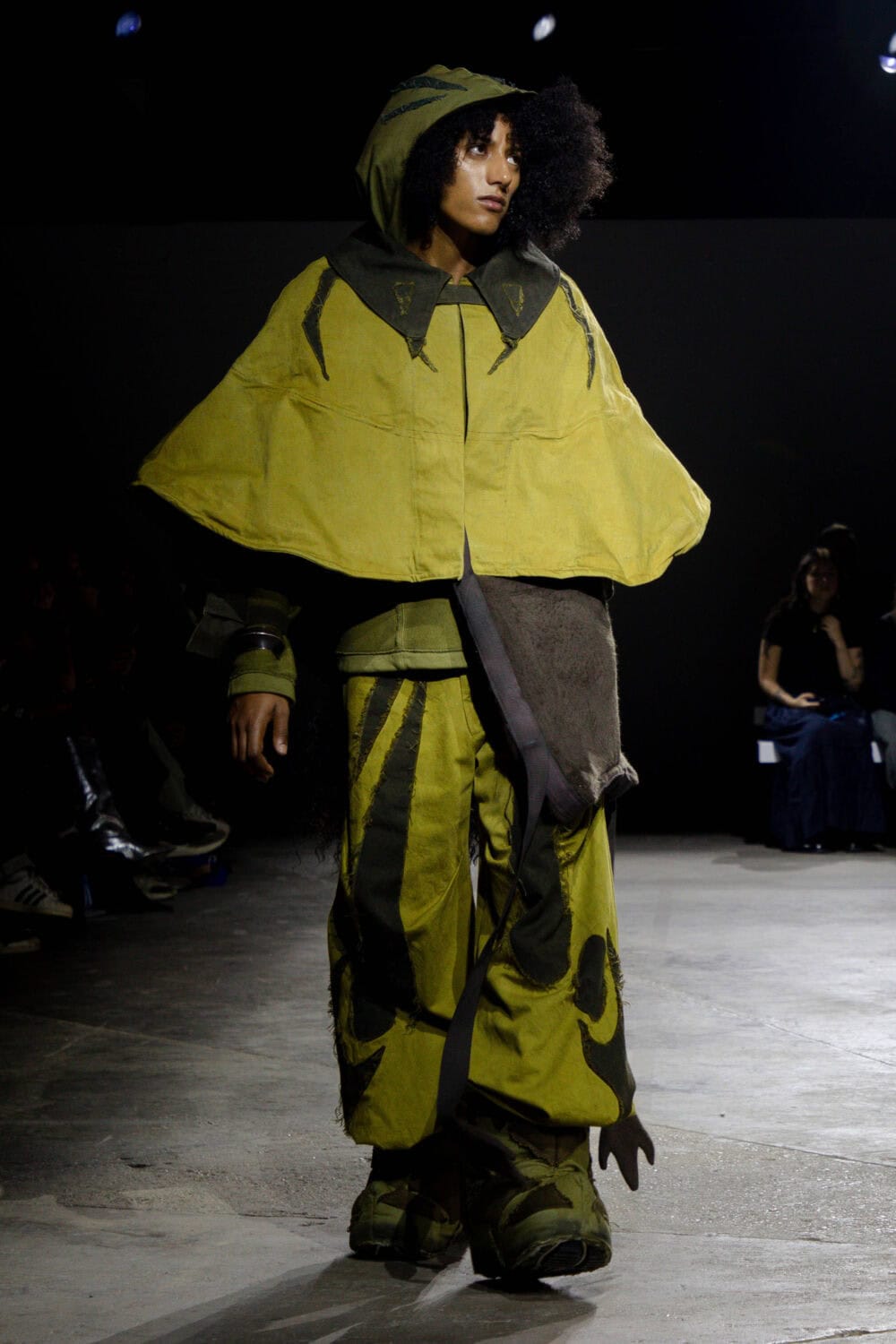 Birthed from the nostalgia of RPG games, looks were dense with narrative. Trousers billowed like sails caught in wind, cinched tightly then released in soft collapse. Outerwear appeared aged and travel-worn, all straps, layers and raw hems. One shredded grey hoodie clung underneath a transparent knit, while acid green padded trousers were paired with a camo windbreaker – a collision of terrain and function. A graffitied coat layered over a shirt-tie hybrid and patchworked skirt-trouser ensemble hinted at worlds survived, not just imagined.