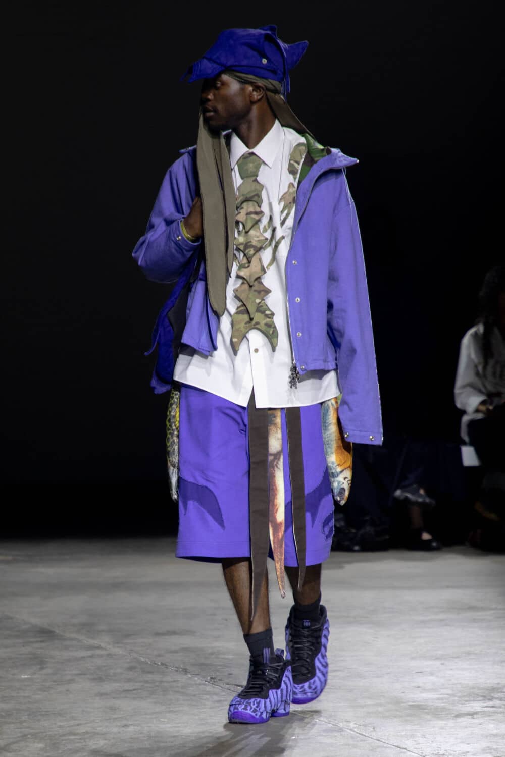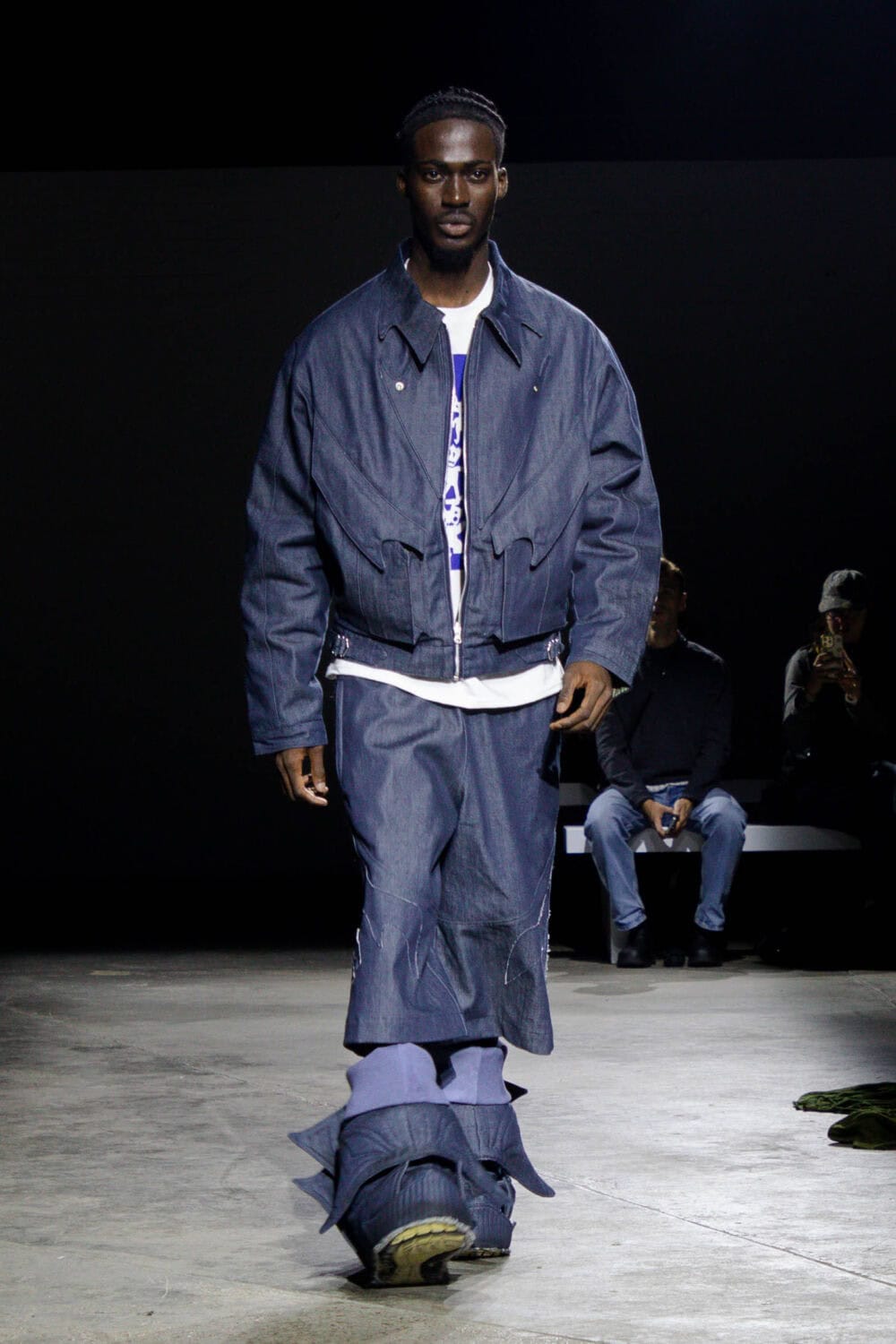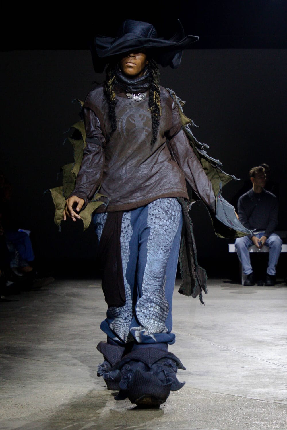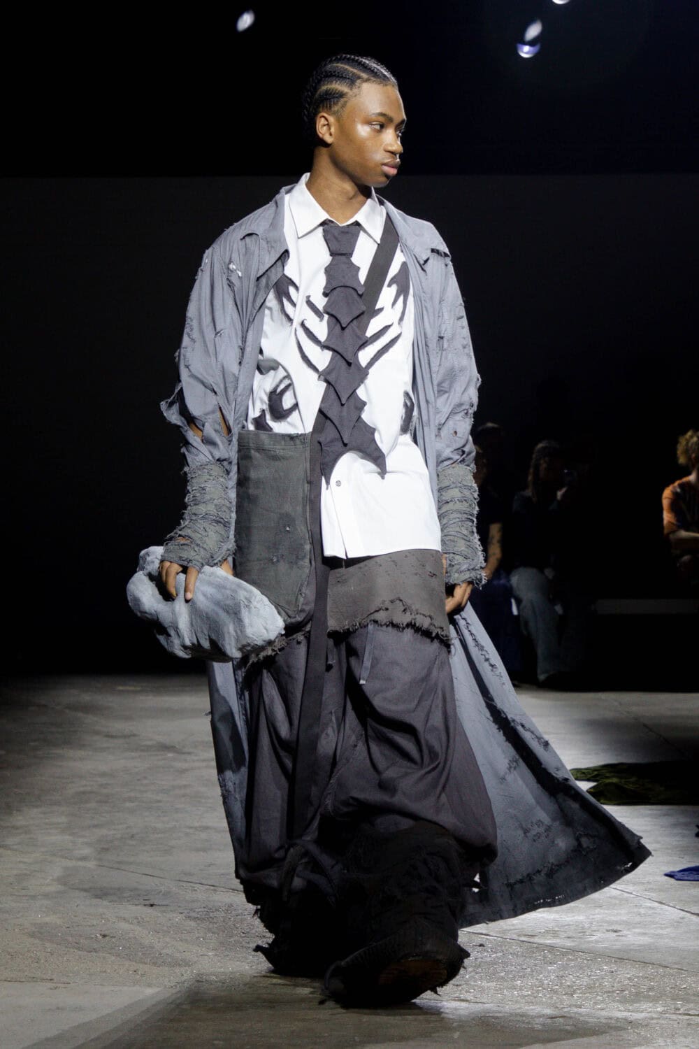 Birthed from the nostalgia of RPG games, looks were dense with narrative. Trousers billowed like sails caught in wind, cinched tightly then released in soft collapse. Outerwear appeared aged and travel-worn, all straps, layers and raw hems. One shredded grey hoodie clung underneath a transparent knit, while acid green padded trousers were paired with a camo windbreaker – a collision of terrain and function. A graffitied coat layered over a shirt-tie hybrid and patchworked skirt-trouser ensemble hinted at worlds survived, not just imagined.