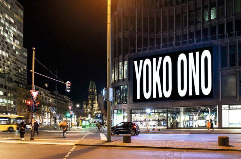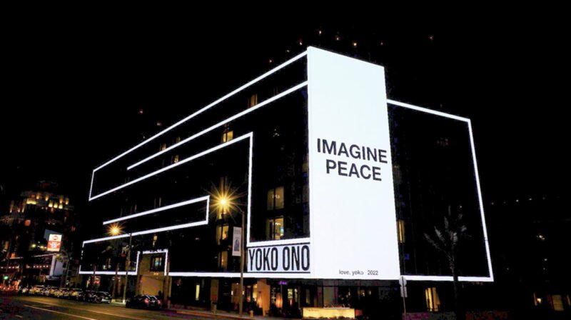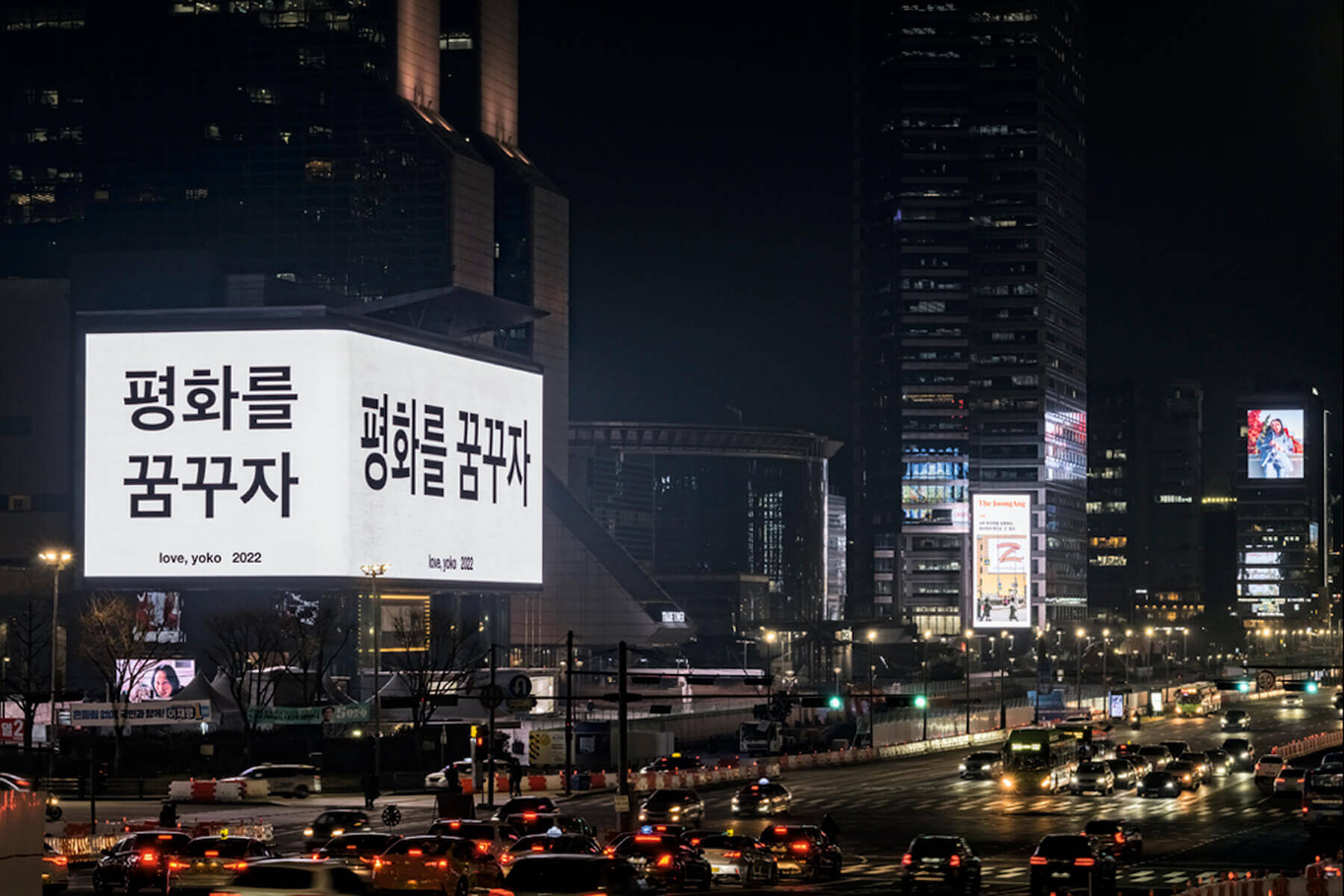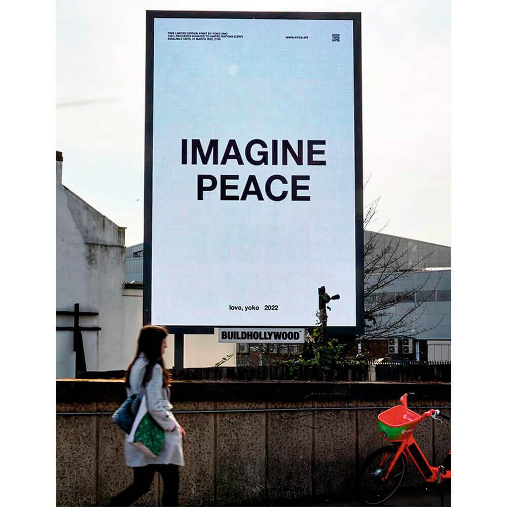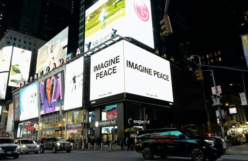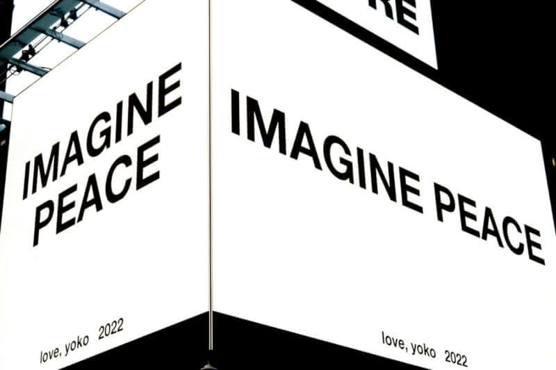 Ono’s work doesn’t ask us to imagine specific examples of peace but they do co-opt spaces that are usually used to promote products, which as an act is itself subversive, jolting the viewer into a new frame of reference. Kathleen Lynch, Director of Operations for Art Production Fund, which staged Ono’s Imagine Peace installation in Times Square in 2012, told me, “When people encounter an artwork in public, they aren’t necessarily seeking it out. Encountering it on your walk home or on the way to work can be incredibly impactful because the experience is unexpected.” Cherix said that utilising these commercial spaces “emanates from [Ono’s] early belief that you do not need a museum, a gallery or a publisher to change the world.” It is also disruptive to ask someone to imagine peace somewhere so dedicated to capitalism, such as Times Square. The nature of capitalism is to protect the status quo; it allows no room to imagine an alternative.