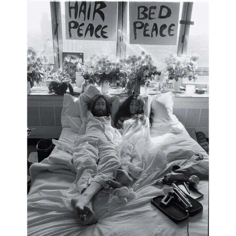 They became a couple and married in 1969. Their fame allowed Ono to engage with an audience that her work had previously not reached. Lennon and Ono performed Bed-In for Peace during their honeymoon in Amsterdam and Montreal, protesting the still-ongoing Vietnam War. Taking inspiration from non-violent protests like sit-ins, they invited reporters to their hotel bedroom to debate the topic. Later that year, they staged a multimedia campaign that included advertisements, billboards, posters, radio spots and postcards – all of which said: “War Is Over! If You Want It. Love and Peace from John & Yoko” – and co-wrote Imagine, which has its roots in Grapefruit. In 2015, Lindsay Zoladz wrote in New York magazine that, “Ono’s art came alive when it broke out beyond the avant-garde, because her mission was to awaken the artist in everybody – not just those who were cool enough to know about the latest goings-on in that Chambers Street loft.”