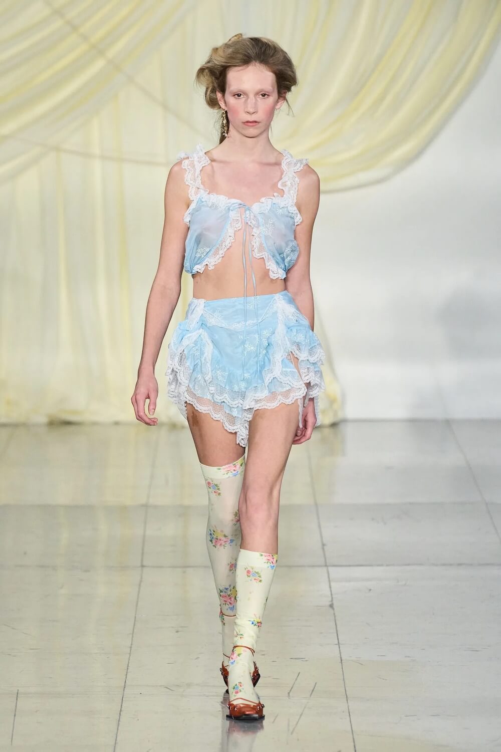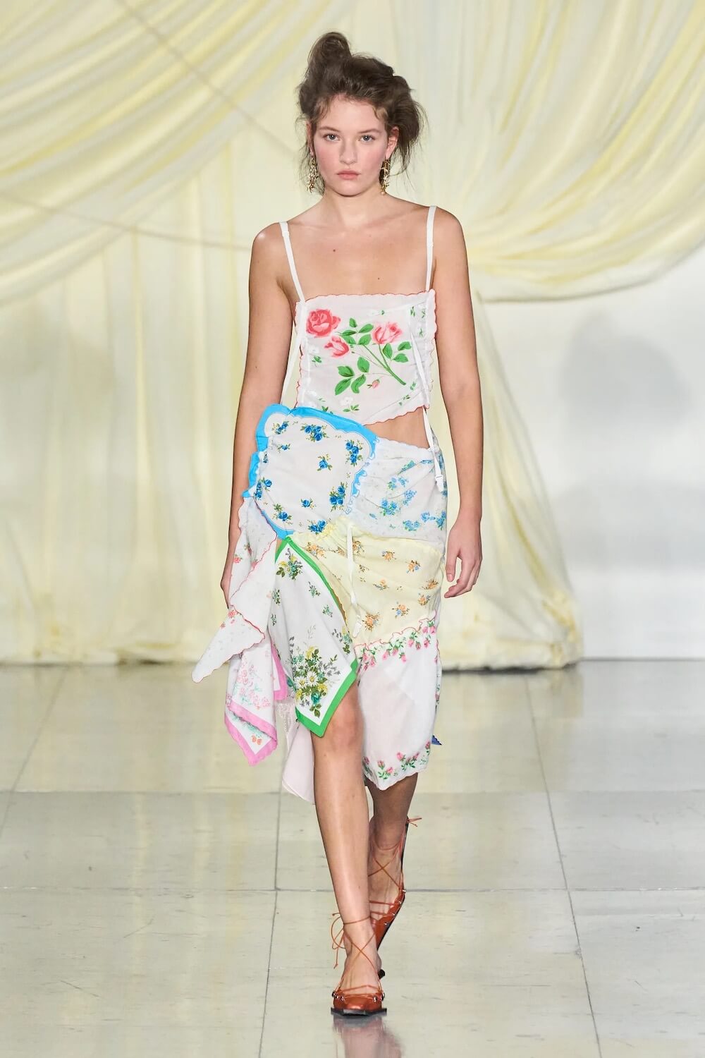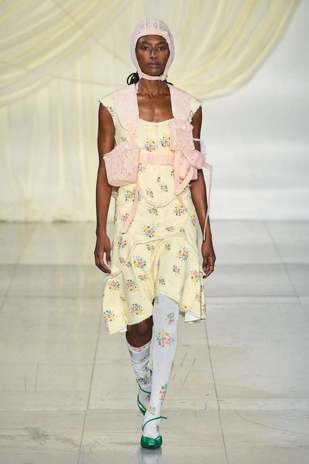 For Yuhan Wang, it was a season spent ruminating on flight that brought her SS23 collection into being. In particular, the Central Saint Martins grad looked to apsaras for inspiration – ethereal female beings that inhabit the skies and seas within Hinduism and Buddhist cultures. So, erring on the side of subversion, the romantic designs were like Marie Antoinette-undressed meets Little House on the Prairie if the Ingalls family flew early twentieth century airplanes. Think spliced-up handkerchief patchwork, sweet dove jewellery, frilly nightwear underscored with knee-high floral socks and mesh dresses embroidered with blue birds, donned by a diverse cast of models all sporting lavish teased and tucked up-dos with youthful, rosey cheeks.