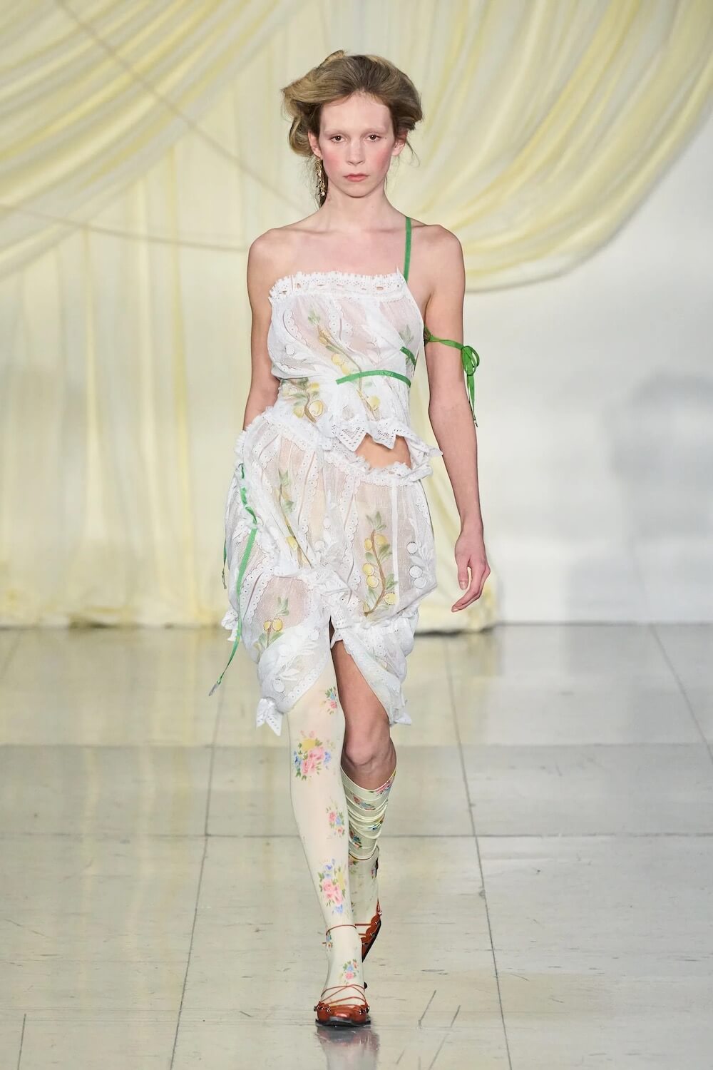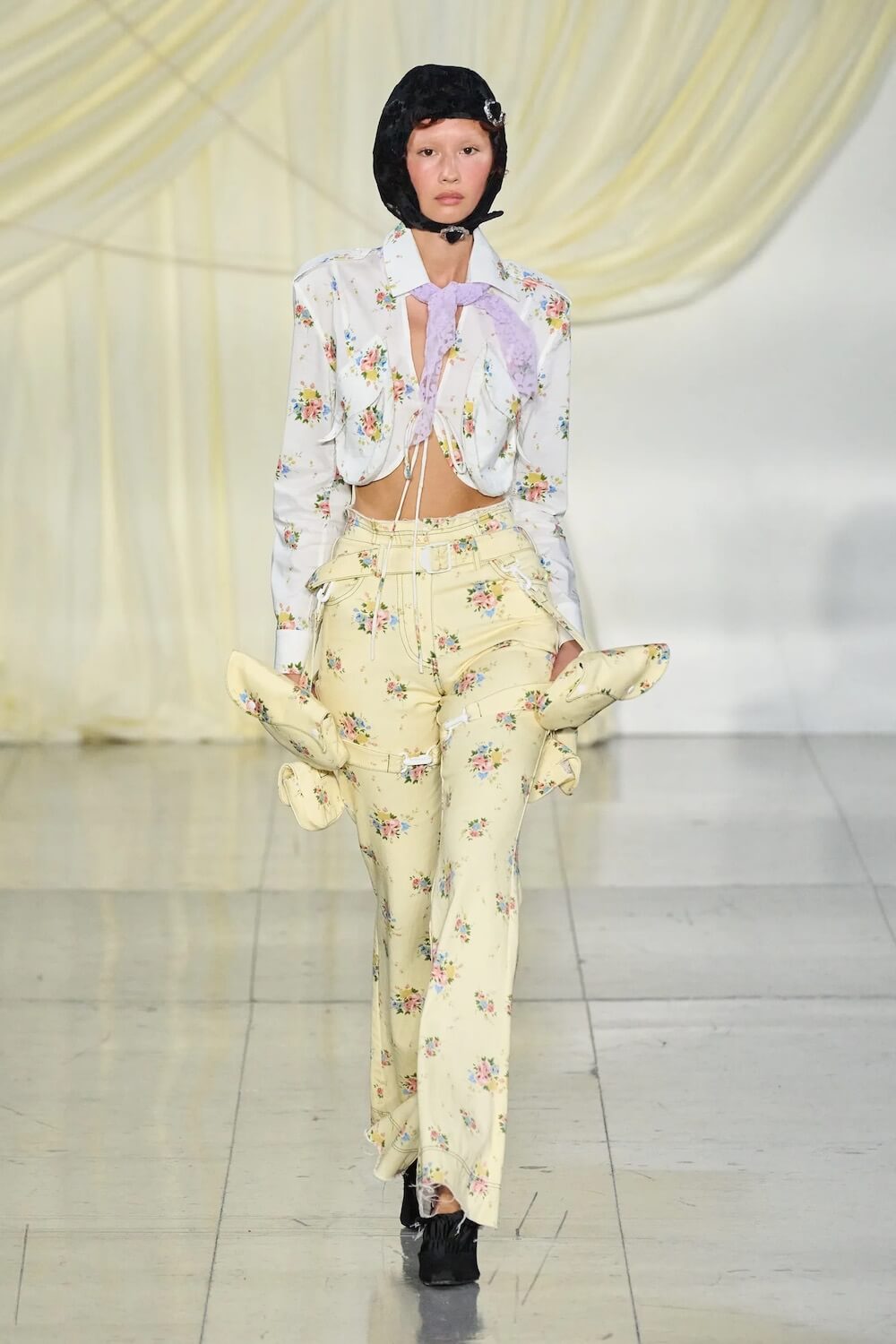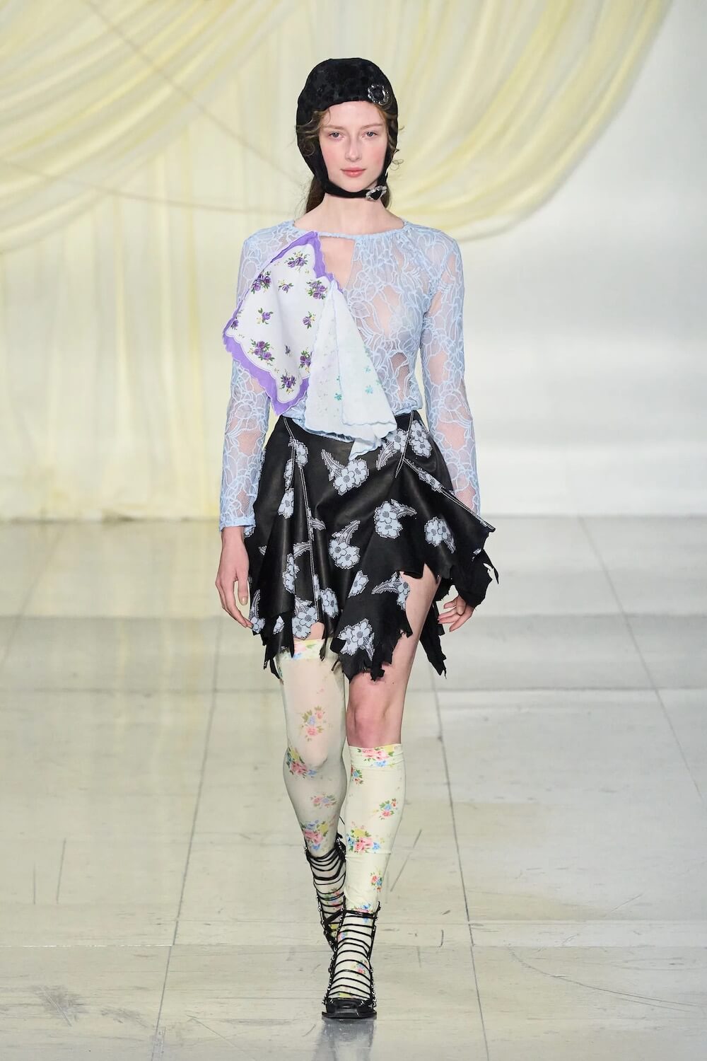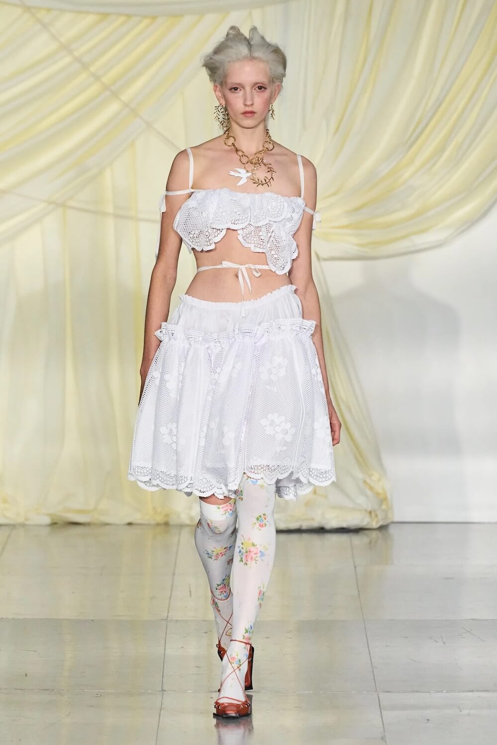 For Yuhan Wang, it was a season spent ruminating on flight that brought her SS23 collection into being. In particular, the Central Saint Martins grad looked to apsaras for inspiration – ethereal female beings that inhabit the skies and seas within Hinduism and Buddhist cultures. So, erring on the side of subversion, the romantic designs were like Marie Antoinette-undressed meets Little House on the Prairie if the Ingalls family flew early twentieth century airplanes. Think spliced-up handkerchief patchwork, sweet dove jewellery, frilly nightwear underscored with knee-high floral socks and mesh dresses embroidered with blue birds, donned by a diverse cast of models all sporting lavish teased and tucked up-dos with youthful, rosey cheeks.